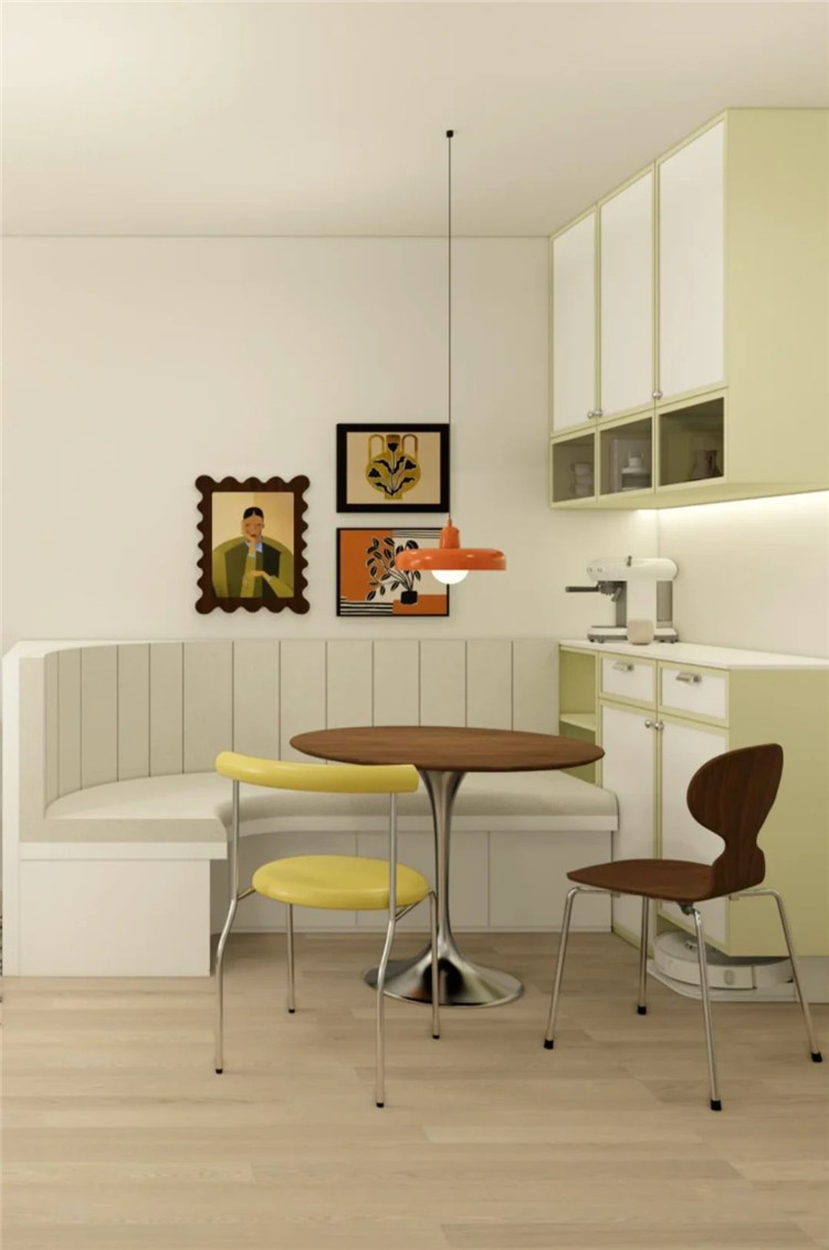 對小戶型來說,餐邊柜結合卡座一體設計就非常實用,卡座打破傳統餐廳的單調性,可以替代兩把餐椅,節省空間的同時又能容納多人用餐。