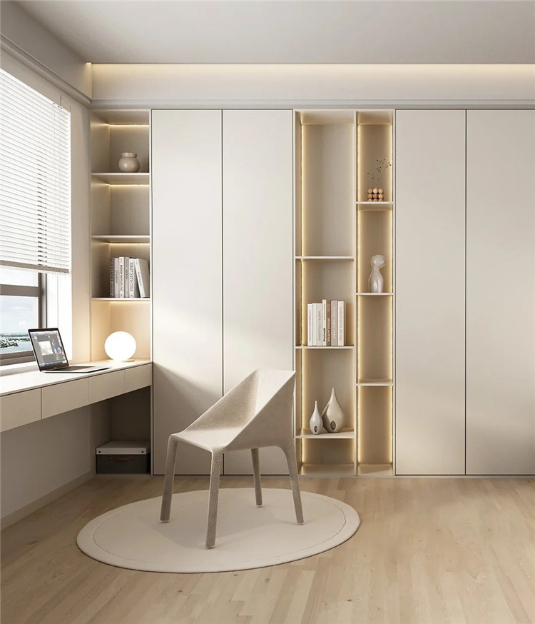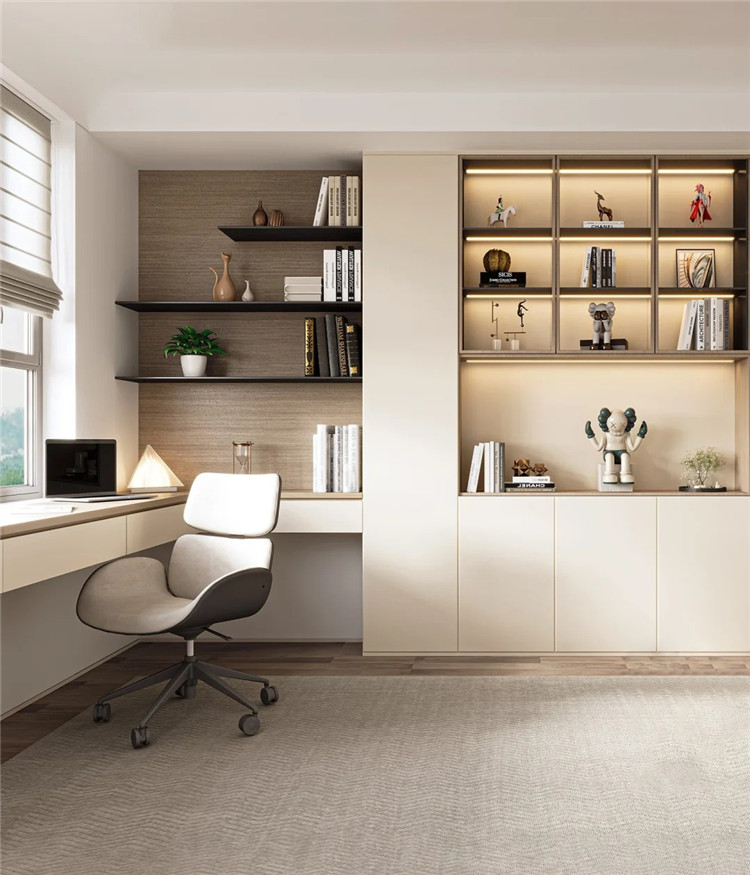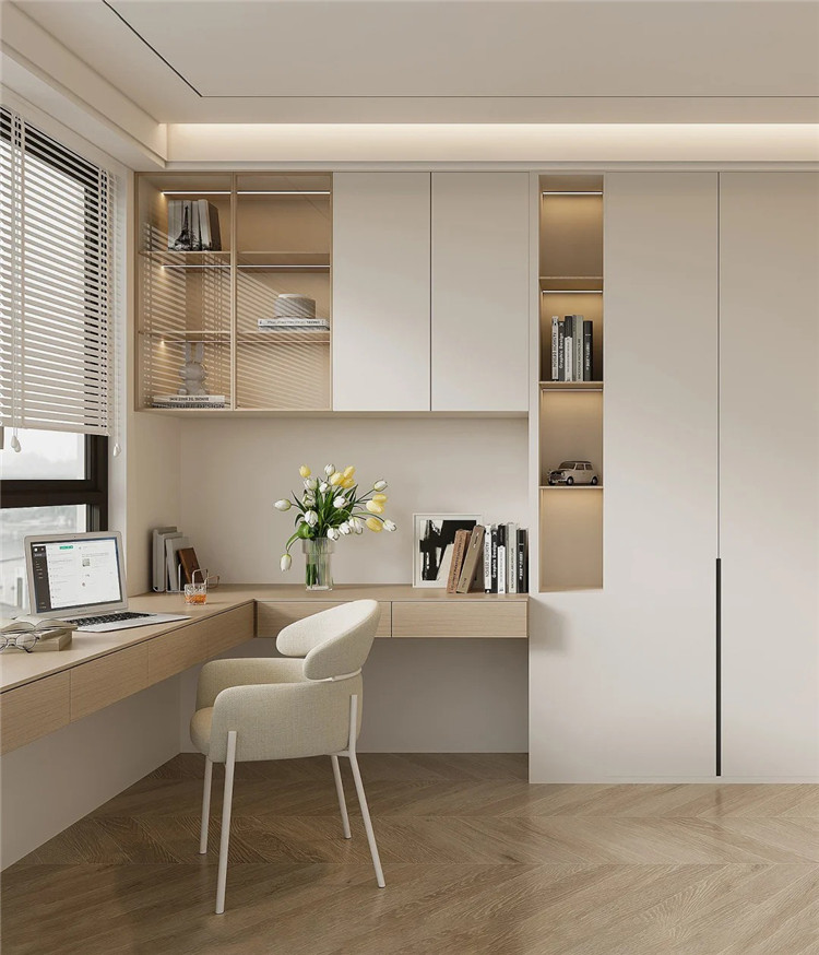 如果收納需求比較高的話,可于書桌上方做吊柜,或將懸浮書桌銜接書柜。