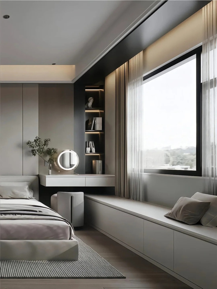 位于飄窗旁的轉角,可定制開放式收納格,增加儲物量的同時,也不壓縮空間,兼顧了顏值與實用性。