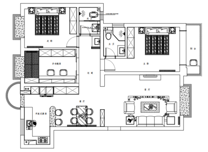 陸景苑的這套138㎡的三居室住宅為朝西戶型,整體的結構四四方方且沒有犄角,最大的問題在于不夠通風透氣,且陽光難以進入室內。因此設計師在進行規劃設計的時候,很大程度上保留了原來的戶型功能結構,同時將各個功能區域的窗戶進行擴大處理,有的直接改造為落地窗,以提升室內采光、通風效果。