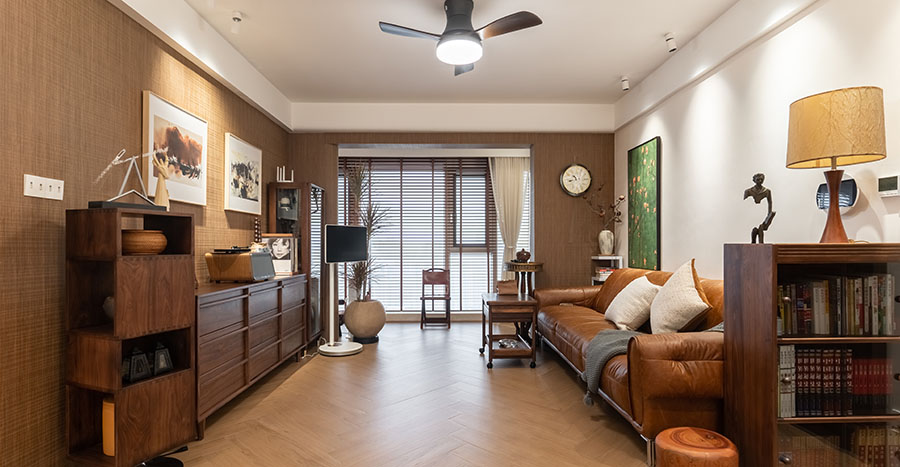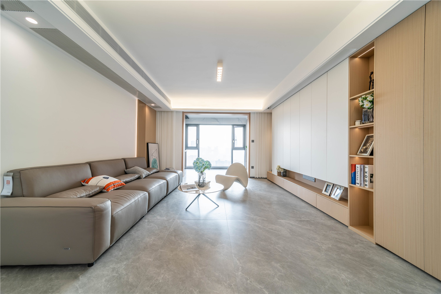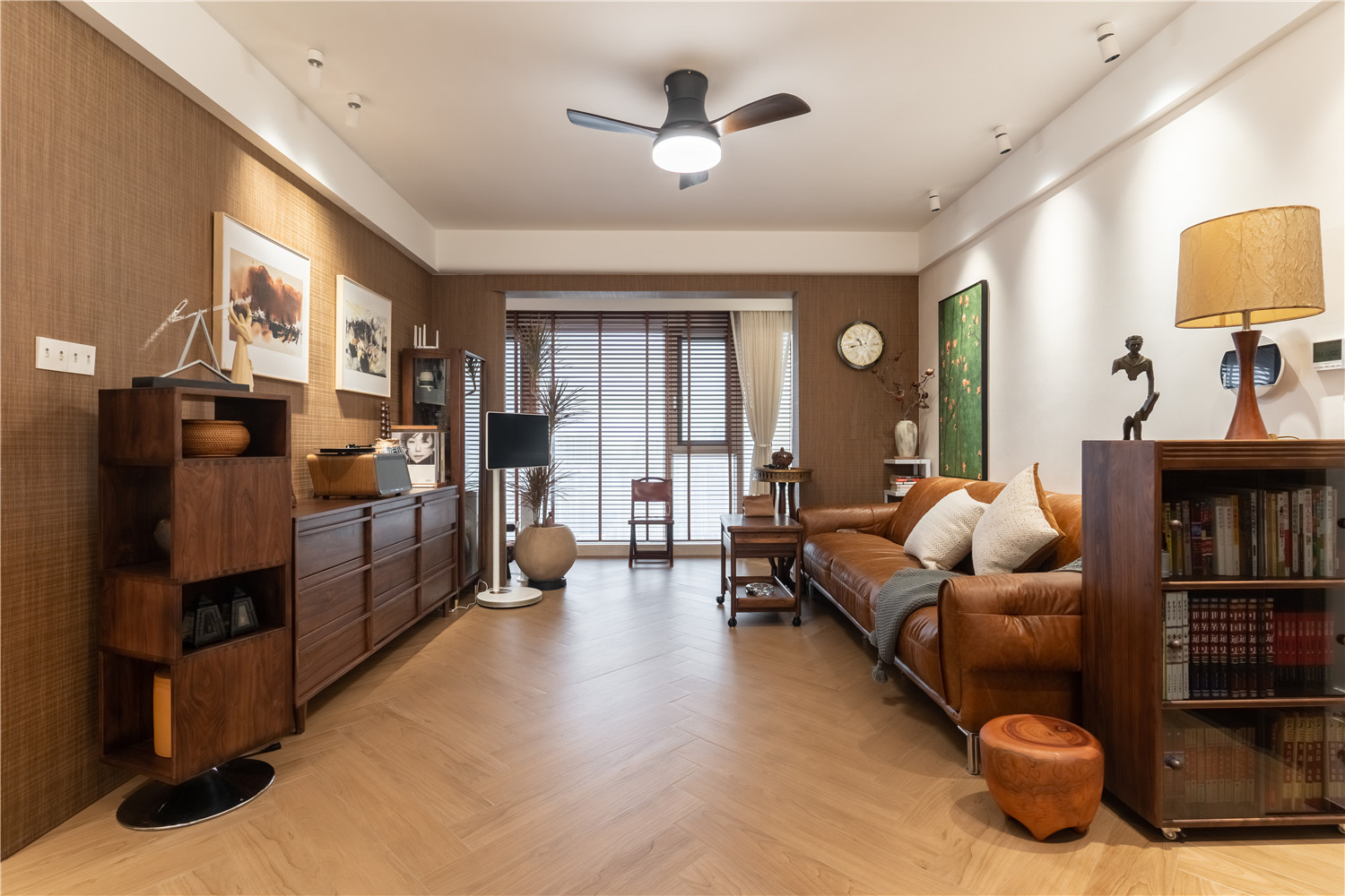客廳借用大面積的書柜作為背景墻裝飾,簡約而又不失使用感,同時還有效提升了空間的文藝氛圍。