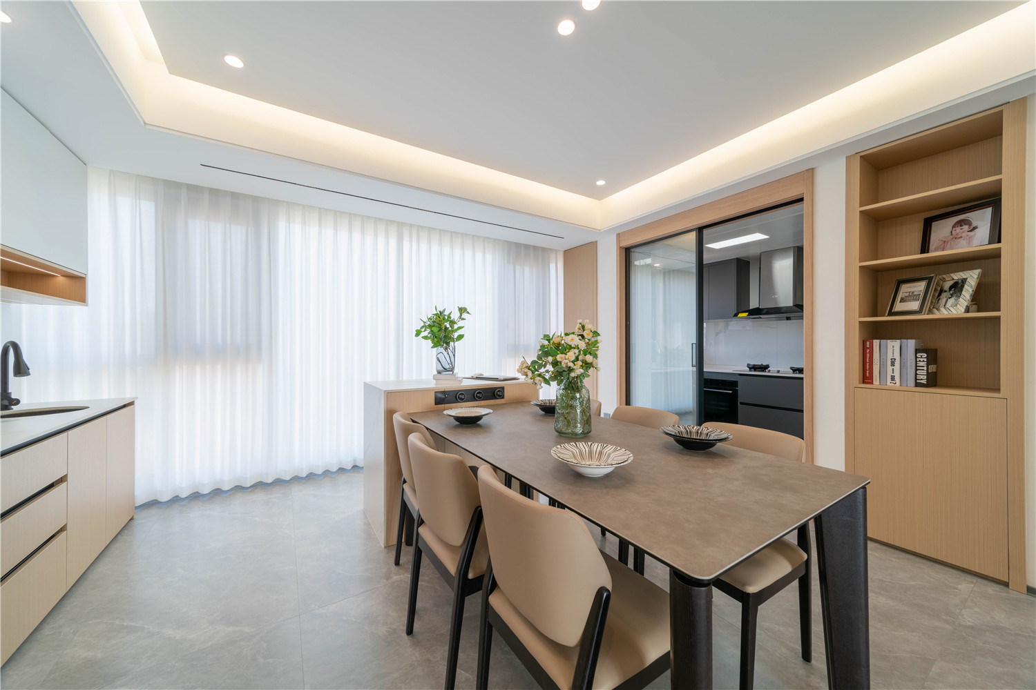 就餐區域借助白色與木色的碰撞營造一種自然的舒適美,鏤空式的儲物柜搭配上清新做舊的自然藝術掛件,典雅而又藝術感十足。