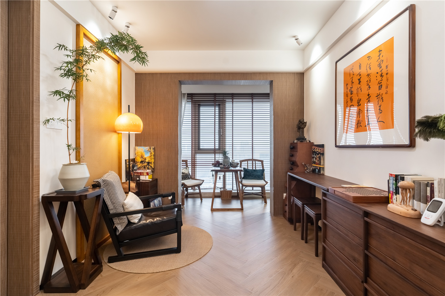 百瑞景這套三居室的住宅占地面積約為90㎡,戶型結構緊湊且空間浪費少,整體需進行改動的區域并不多,且能夠滿足業主的日常使用需求,因此設計師保留了原有的空間結構。為提升空間的利用率,提高業主生活品質,設計師將狹長的客廳中切割出一小塊區域打造成迷你衣帽間,在不破壞會客區域功能使用的同時,有效提升了整個空間的合理規劃性。