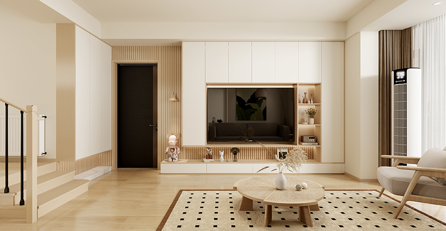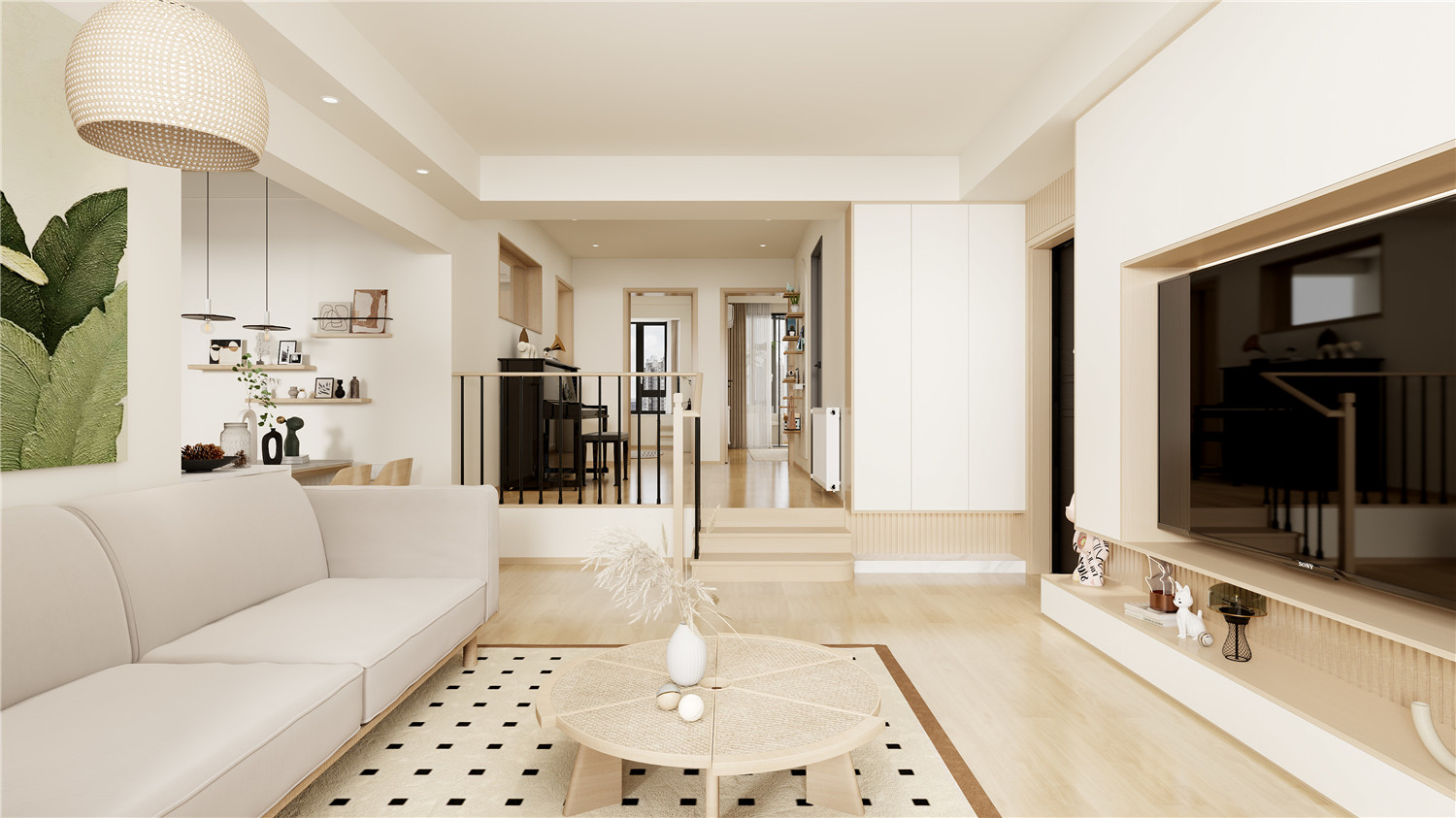 客廳整體用色素雅潔凈,強調柔和溫馨感。大面積的落地窗則確保陽光能夠更好的進入會客區域,提升生活品質。