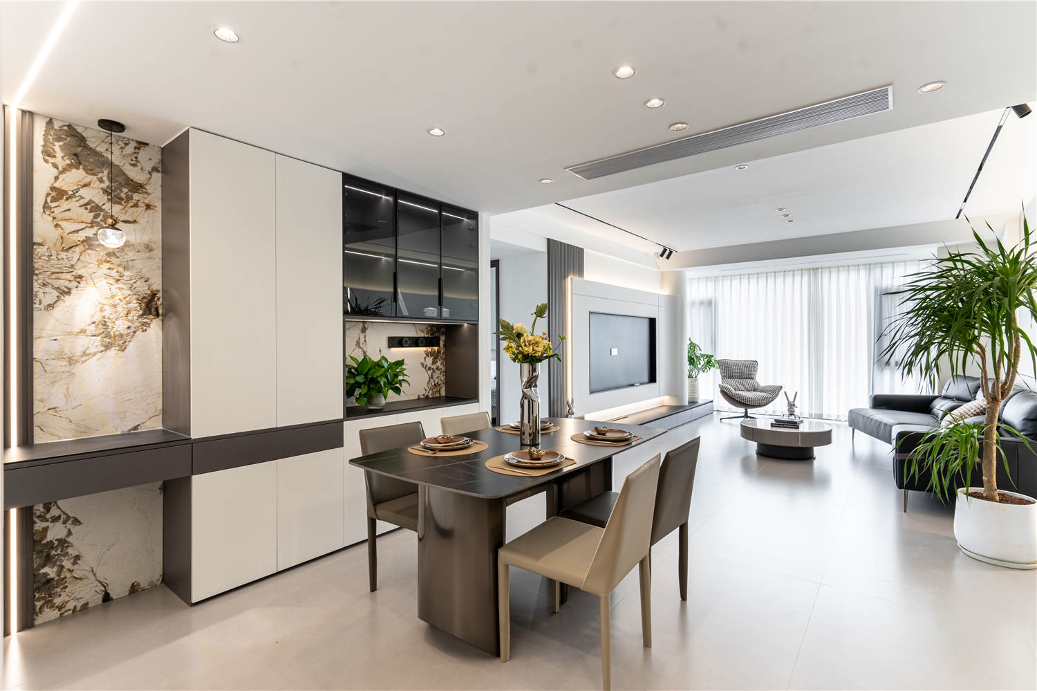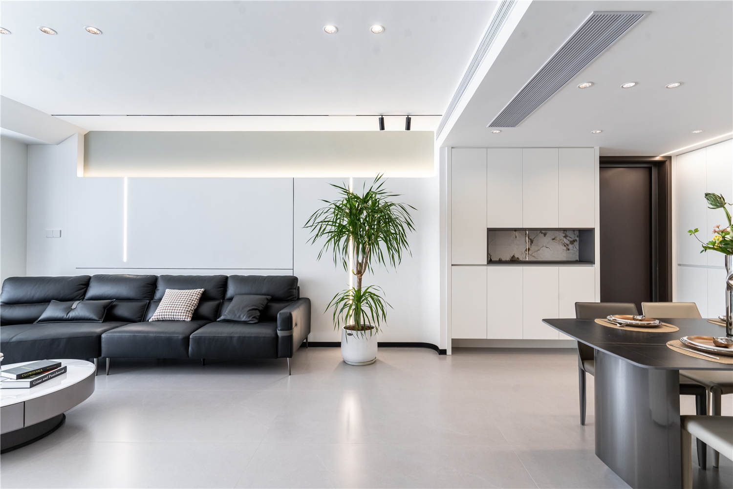 筆直的線性燈則如同精致的紐帶,將陽(yáng)臺(tái)、客廳與餐廳三個(gè)空間無縫串聯(lián),營(yíng)造出連貫而和諧的視覺體驗(yàn)。