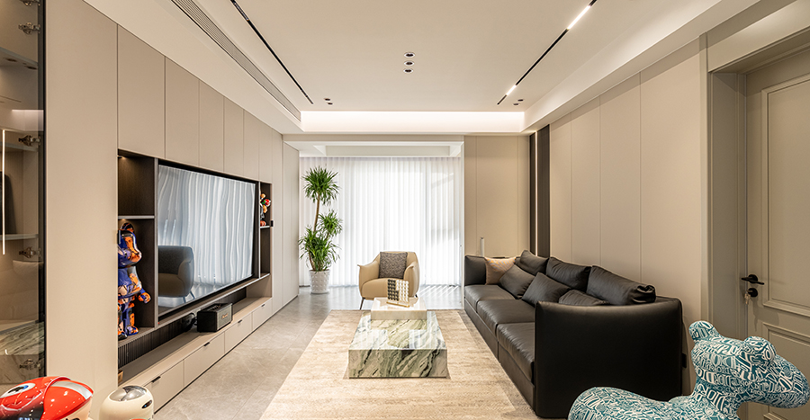 大面積的大理石瓷磚奠定了清冷通透的空間氛圍,搭配以質感溫潤的木材,有效提升了空間的視覺平衡感。