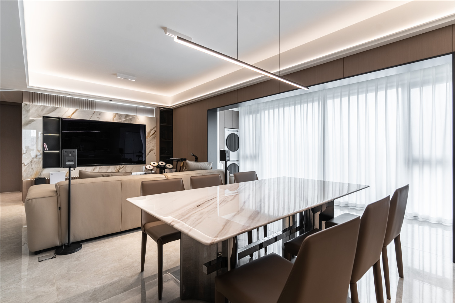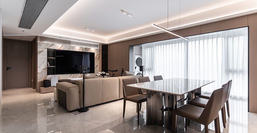 藕色墻面搭配上細線條處理,給人精致的優雅感。弧線形的沙發搭配上圓形茶幾,營造柔和的自然舒適感。