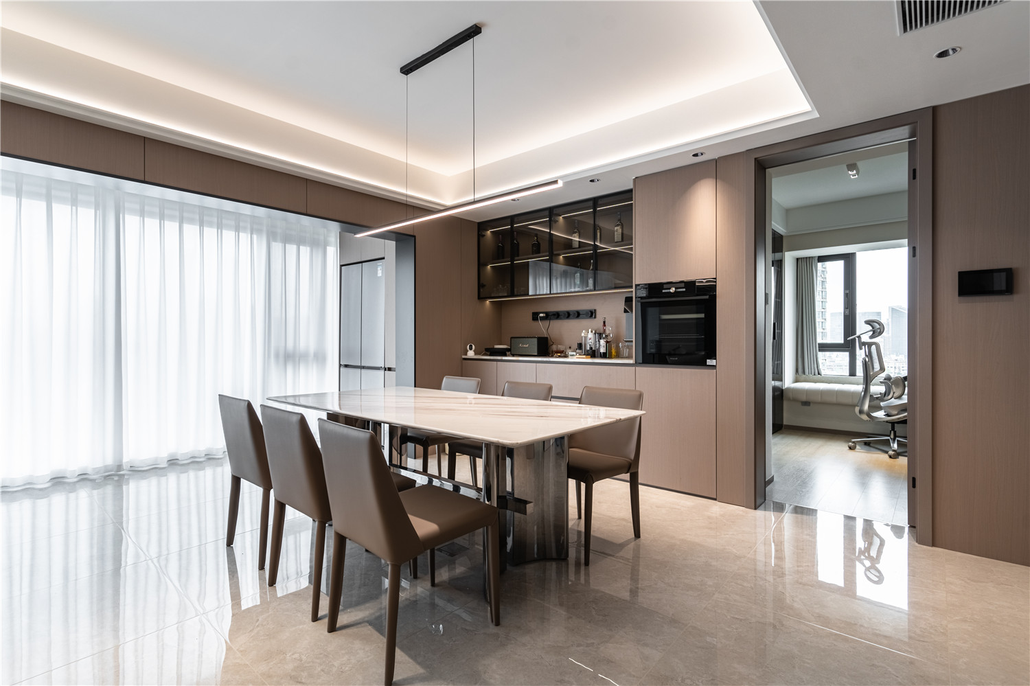 案例簡介:對于空間氣質的表達是一門藝術,本案例的餐廳呈現暗色系的現代感官,這里沒有喋喋不休 寧靜有增長心靈的力量,似乎能讓人感知優雅的存在。整個家居空間則以原木色與白色為主體,拾取飽和度較低的灰黑色系點綴,讓整個空間在舒適簡單中隱隱散發高級的質感。