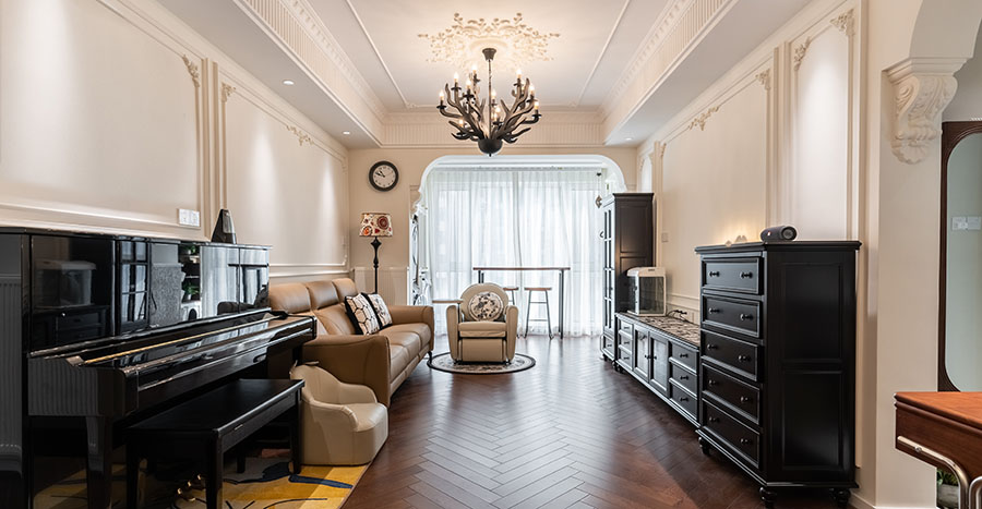 軍運村這套300㎡的復式別墅空間十分寬敞,且南北通透,帶有南向大陽臺,整體戶型優勢較為明顯。因此設計師在進行規劃設計的時候,充分利用了空間的優勢,借助各種大面積窗戶的設計,提升室內采光。為了擴大陽臺空間,提升家居品質,設計師將客廳的陽臺與臥室陽臺直接打通,將整個陽臺空間改造成視角極佳的觀賞區,便于業主與家人觀賞室外美景。