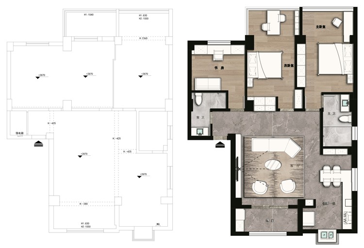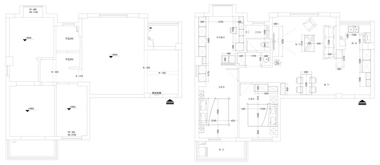 舒心苑這套三居室的住宅占地面積約為145㎡,整個戶型結構相對比較規整,不過原有的戶型結構并不能很好滿足業主的使用需求,因此設計師將主臥區域與外部陽臺空間直接打通,將小陽臺直接納入主臥,提升臥室區域的舒適感與采光度。為了滿足業主在家辦公及閱讀需求,設計師將其中一個次臥改造成小書房,同時將客衛的面積向書房延伸,提升衛浴空間的占地面積,以滿足正常使用需求。