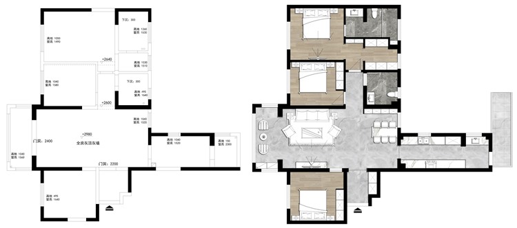 這套位于泛海國際的四居室住宅建筑面積約為175㎡,戶型結構雖然不算很規整,但是好在也沒有各種難以設計處理的犄角空間。為了將空間更加合理的利用,設計師將房屋中相對比較突兀的區域改造成廚房,這樣能夠借助戶型的結構將廚房油煙更好的釋放出室外。同時,為了提升主人的家居質量,內部兩個小空間則直接融入主臥中改造成主臥附帶的衛浴空間與迷你衣帽間。