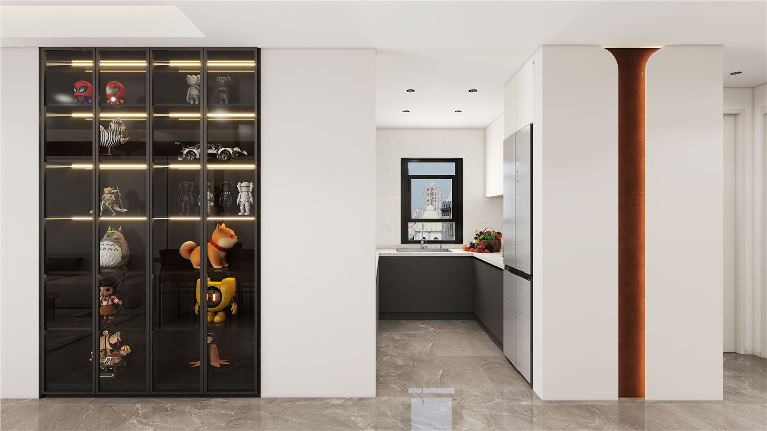 廚房空間相對比較狹長,因此設計師沒有做過多的設計,而是強調可能性,同時借助簡約的暗紋瓷磚提升廚房空間的品質格調感。