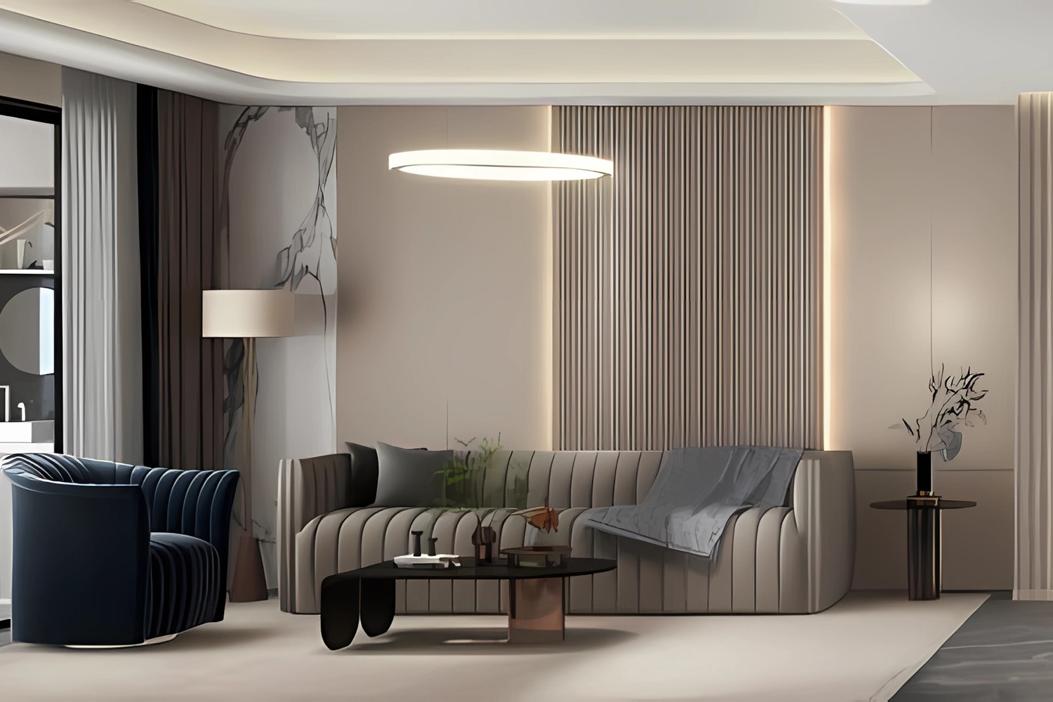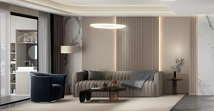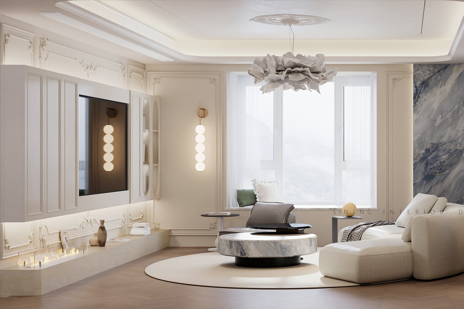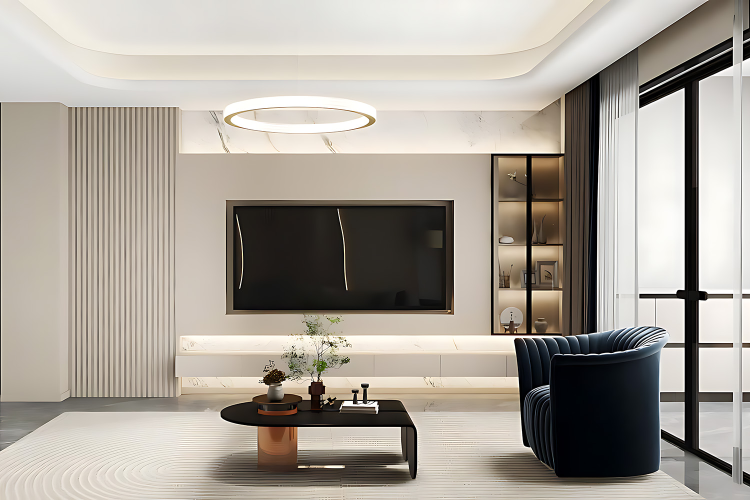 裸墻面搭配上結構式處理簡約而又不失個性摩登感,又曲線型打造的地板搭配上圓形茶幾,營造超現代的獨特品味感。