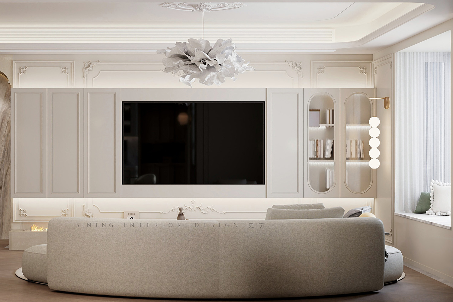 原本色搭配上白色強調空間簡約整潔氛圍,曲線型沙發、圓形吊頂以及圓形地毯則通過線條的變化來提升空間的獨特藝術氛圍。