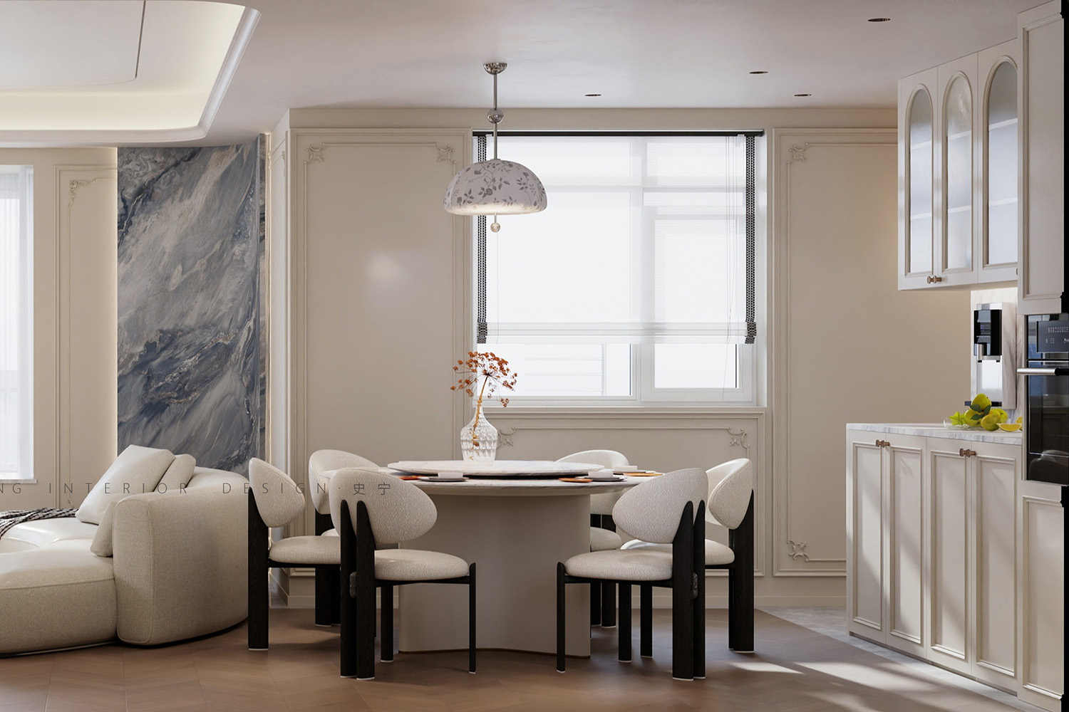 簡約的灰色餐桌椅強調實用性,墻面處的壁畫則為就餐區域增添藝術時尚氛圍。