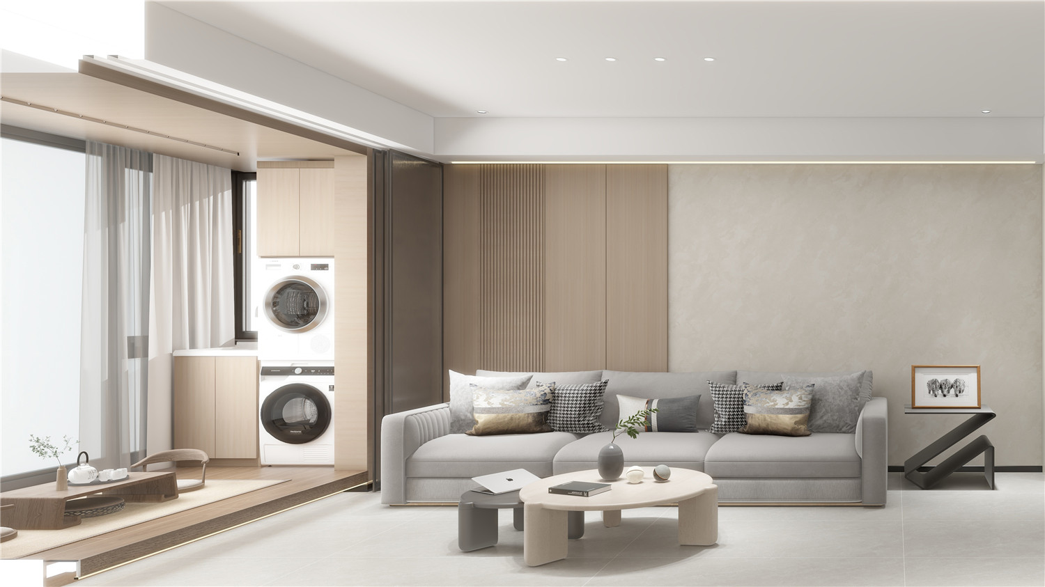 客廳空間利用溫潤的家具搭配水墨畫背景,展現出東方的禪意之美,傳達出舒適素雅的格調;沙發、茶幾、燈具、地毯等家具裝飾,既彰顯了中式的儒雅,又滿足現代生活的生活需求。