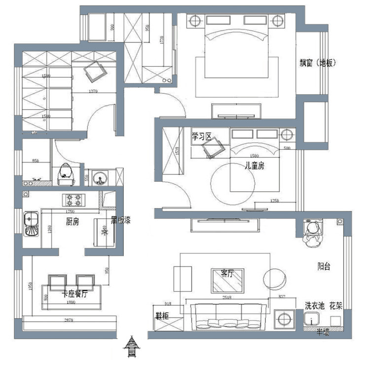 漢口春天的這套89㎡二居室屬于典型的小戶型房屋,因此裝修設計所需考慮的地方較多,不可過于隨心所欲的進行裝飾。不過好在,這套房屋的結構相對比較合理,且沒有存在各種難處理的小角落,因此設計師將設計的重點放在了如何滿足業主及小孩起居需求以及如何營造空間的童心氛圍上。
