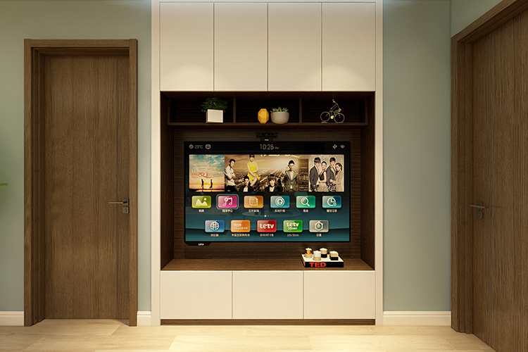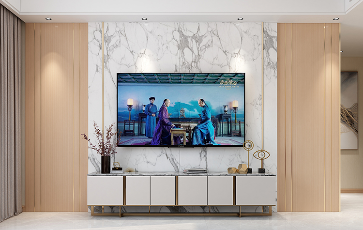 由于客廳區域的寬度并不寬,因此設計師在對客廳進行設計的時候選用了相對比較簡約的元素及簡潔的色彩,以從視覺上起到放大空間作用。整個空間除了縱向墻面裝飾外,沒有其他任何裝飾點綴,有效保障了空間的整潔感。