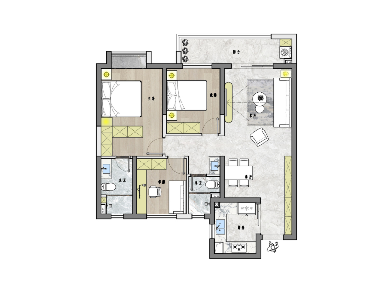4 主衛(wèi)納入主臥,形成便捷套臥;利用L型衣櫥打造衣帽間,增加收納。