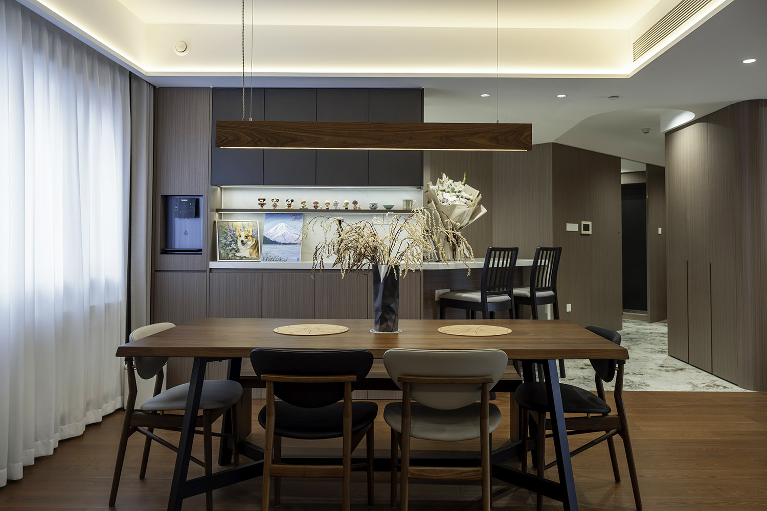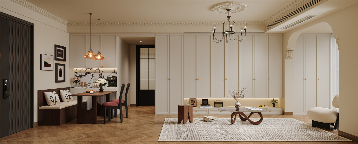 2 餐廳餐桌靠墻擺放,家居動線合理開闊,餐邊酒柜美觀實用。