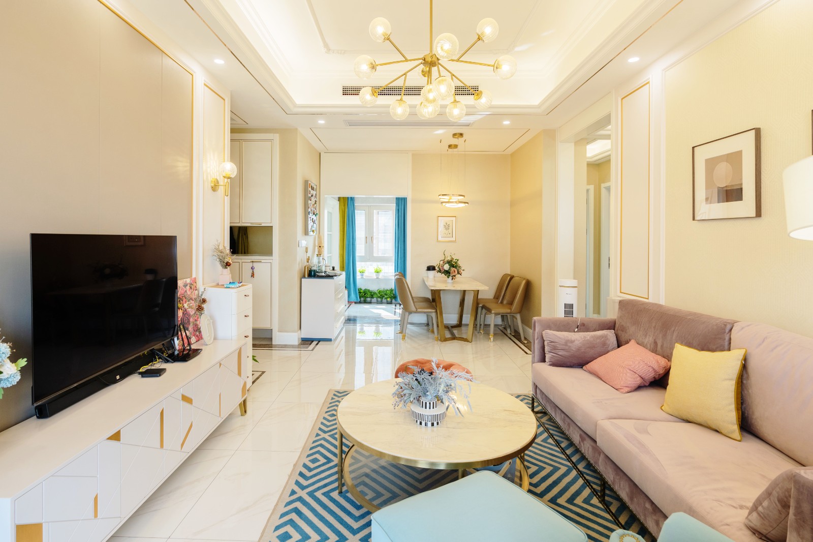 客廳區域主要通過各類色彩來營造空間的精致感與溫馨氛圍。絲絨材質的藕粉色沙發與藍色幾何圖形地毯之間的碰撞高級而又耐看。墻面的金色鑲邊處理,則讓空間的歐式貴族風情得到展露。