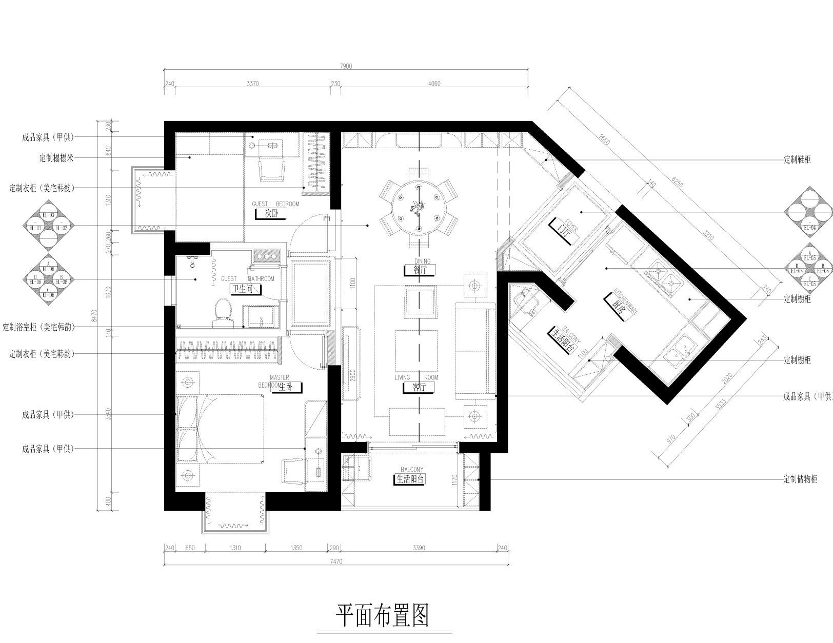 世紀江尚這套89㎡的房屋戶型存在著較大缺陷,原本房屋建筑面積就不算大,還存在著一個突兀的拐角空間,因此在設計時需要對空間的功能區域進行合理的劃分,同時對拐角區域的空間進行合理的利用,以避免空間出現違和感。而由于房屋整體面積較小,因此家具的選擇上則多考慮小體量家具,避免造成視覺違和感。