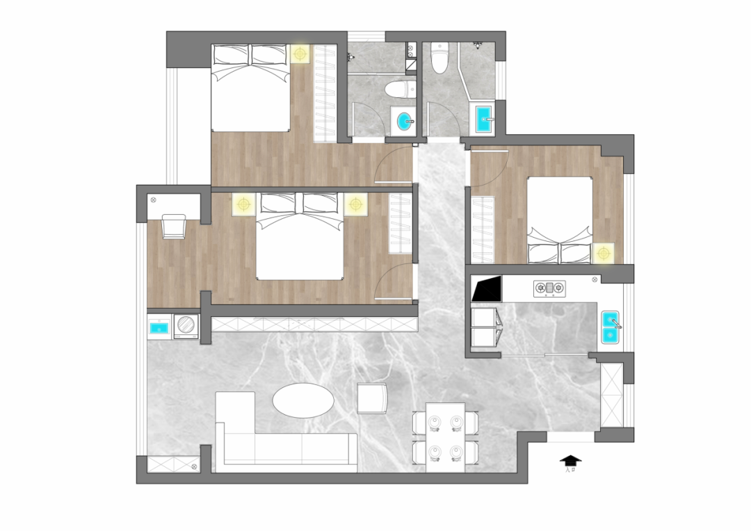4 次臥做干濕分離,增加使用率;保留三間臥室,滿足多人口家庭居住。
