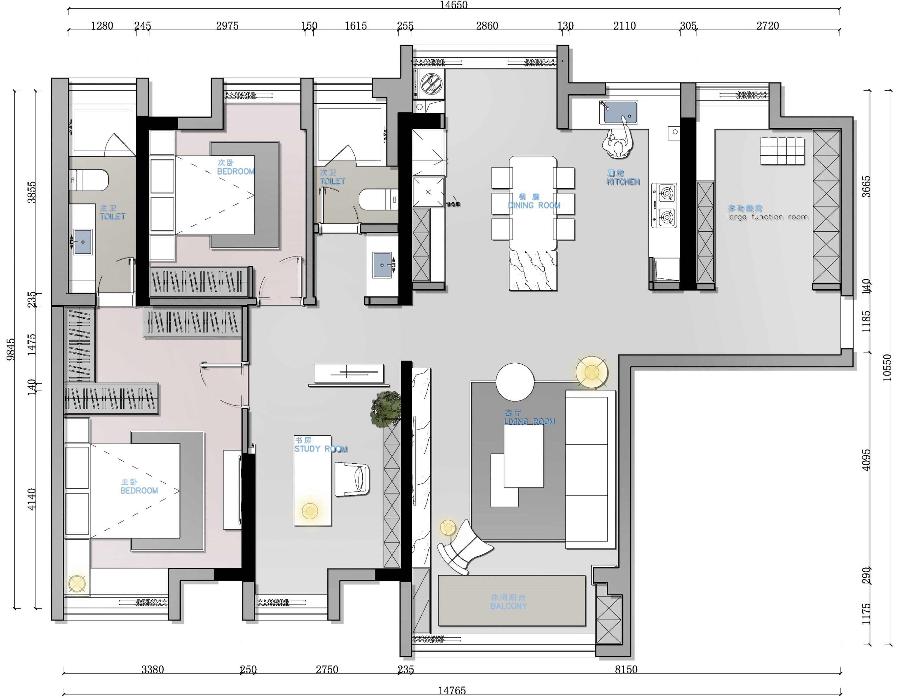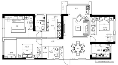 濱江軍苑這套三居室房屋面積約為130㎡,屬于大戶型房屋,整體戶型結構較為平整且南北通透,因此設計師在進行規劃設計的時候充分的利用了戶型結構的優勢,將室外光線引入室內,有效提升了整個家居空間的采光度。而由于客廳區域相對比較狹長,因此被劃分出一塊區域改造為就餐區域,以讓空間格局的視覺效果更加協調。