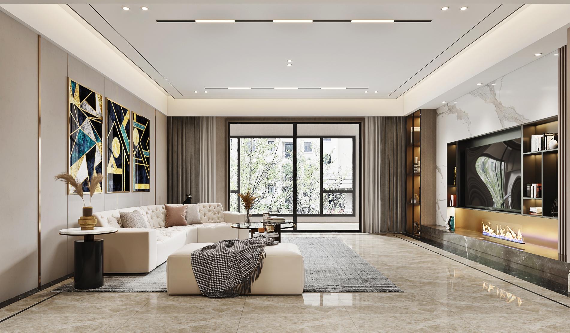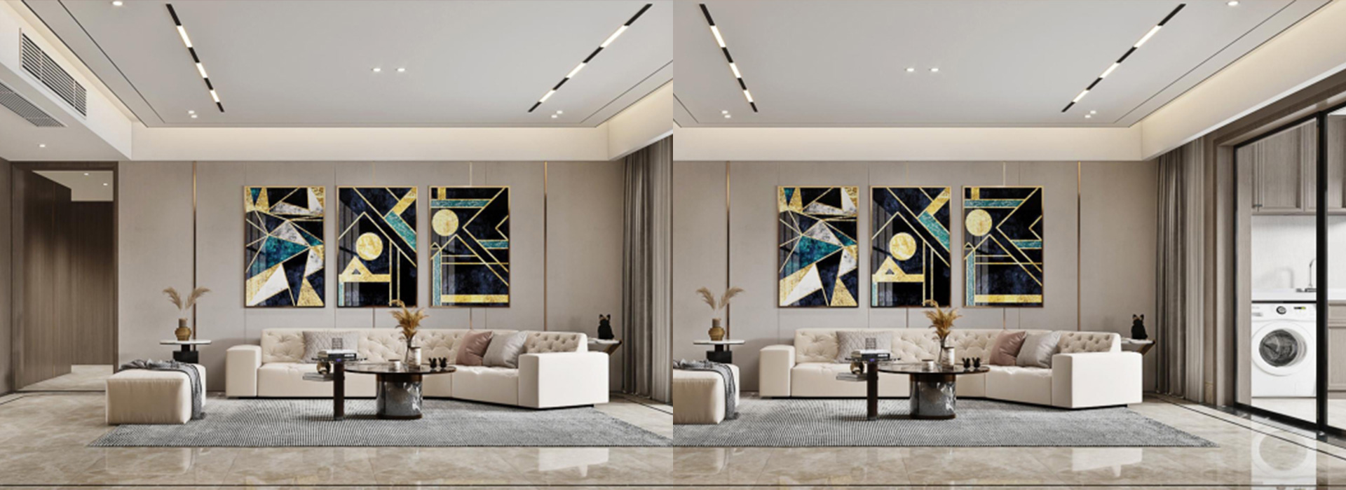 • 以奶咖色作為主基調,選用同色系布藝沙發,柔化了石材帶來的冰冷感。不規則幾何裝飾畫的布置,讓平面的墻活躍起來,造成立體感的視錯覺十分有趣。