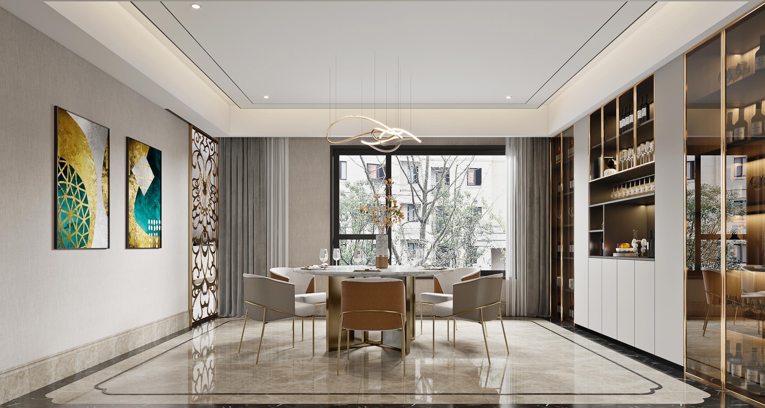 • 大理石餐桌搭上皮質金屬靠椅,獨特華麗有格調。增設餐邊柜及恒溫紅酒柜,提高業主的生活品質。