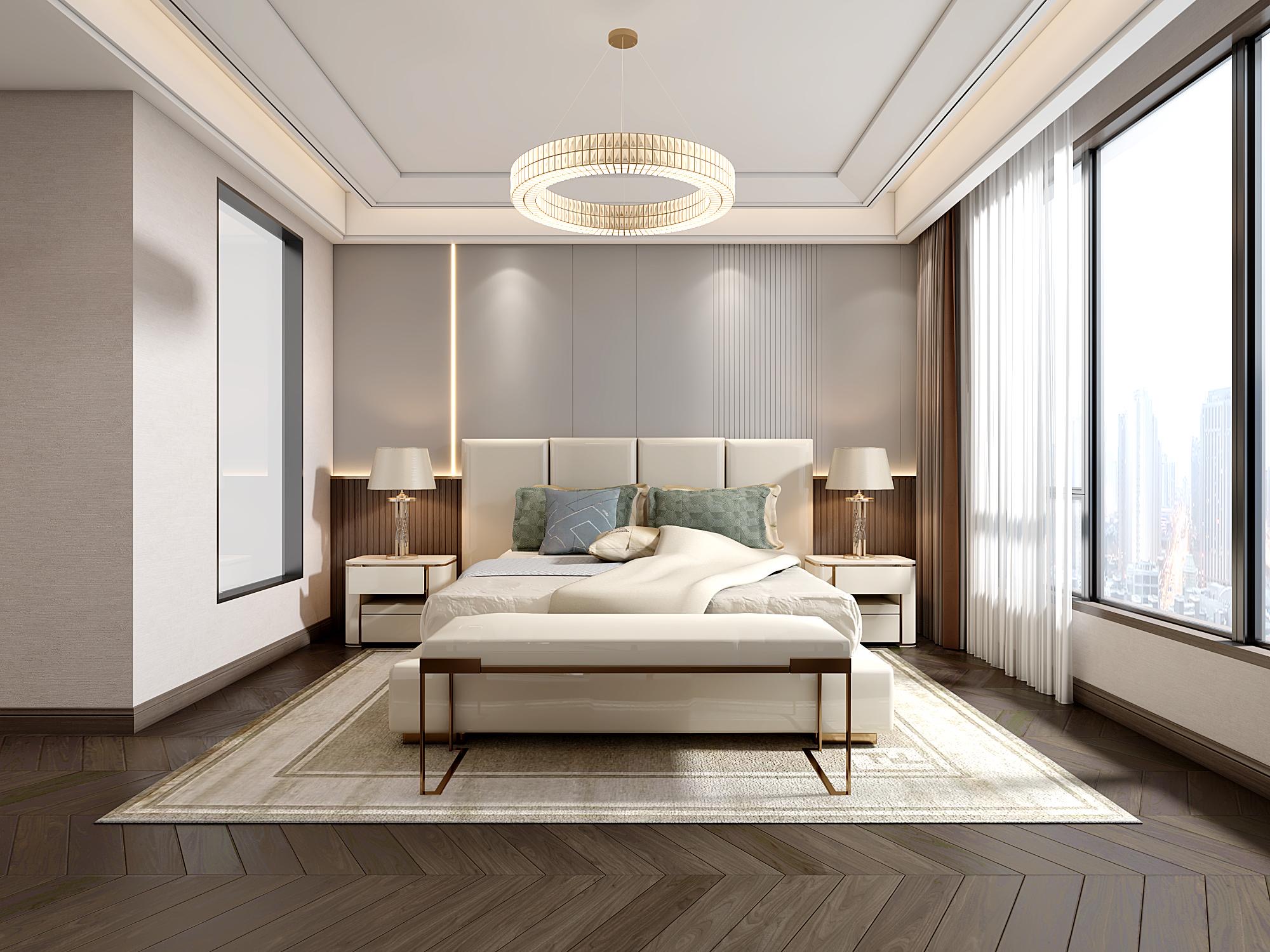 • 床頭背景簡潔溫馨,邊側燈帶的布置是一抹亮點,與整體的線條保持了一致性,簡單又時尚。