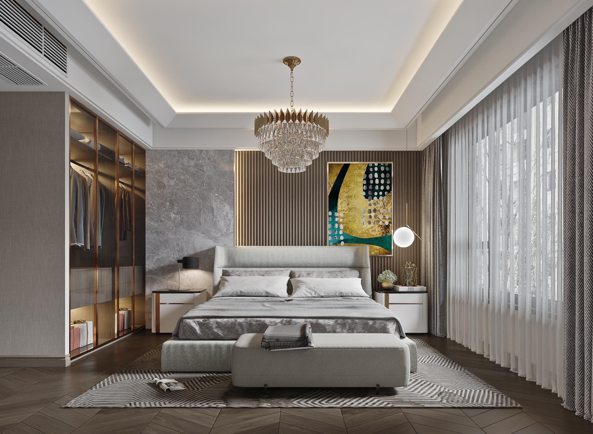 • 老人房配色深沉大氣,背景墻以大理石與木質格柵拼接而成,不對稱的設計加上金框裝飾畫的點綴,彰顯別樣的氣質。