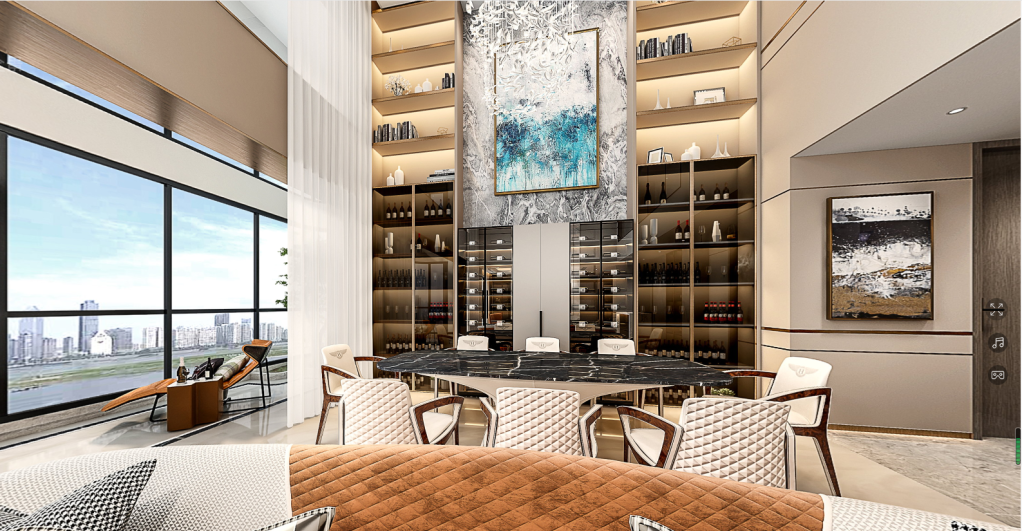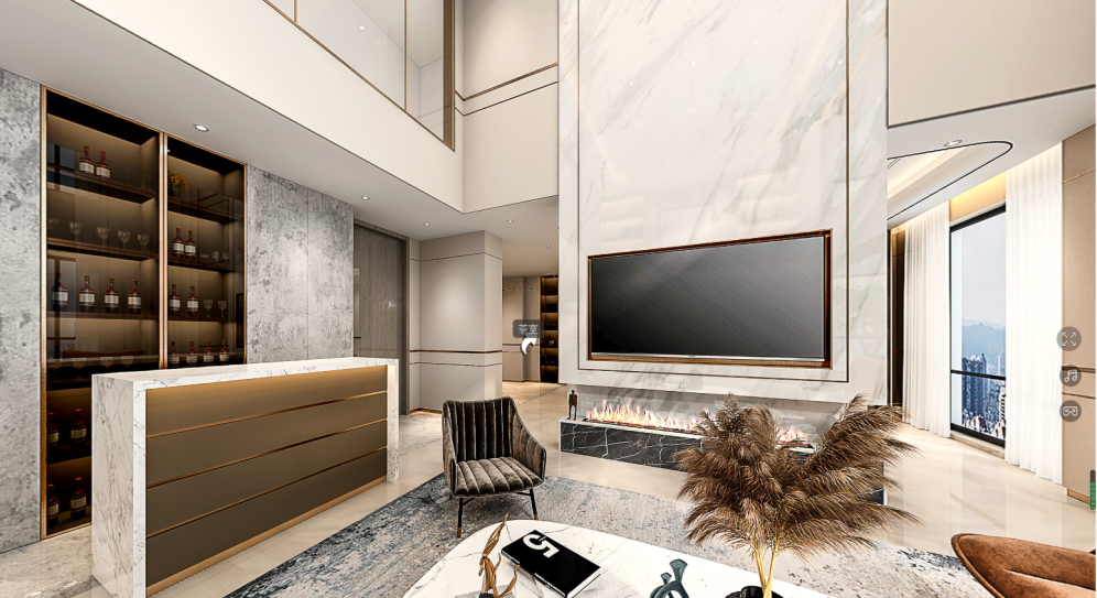 • 巖板的電視背景墻扶搖而上,彰顯大氣風范。電視內嵌其中,邊側以金屬線條進行勾勒,造型簡單用材精致,低調中呈現出輕奢的貴氣質感。 邊側內嵌酒柜,與餐廳酒柜相呼應,金屬色的橫豎交織條不僅使整個空間 更加有層次,突顯沉穩品味。