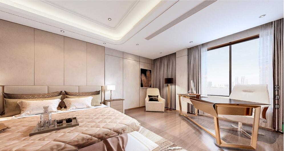 • 以淺咖色作為主色調,呈現溫暖舒適的就寢氛圍。墻面采用白色、淺咖色拼接而成,過渡自然,帶來清新、明快的感覺。 地面選用純實木地板,冬天即使光著腳丫踩在地上也不會冰冷,大氣的寫字臺滿足主人的辦公需要。