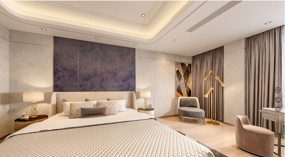 本案通用大色塊基調,加以金屬色的點綴及跳躍,在原本的灰調子里遇見高 雅的鮮明色,活躍生活氣息,營造精致生活氛圍。家具意在于線條與圓弧的碰撞,在配飾上營造著浪漫氛圍,讓客戶在沒有壓力的生活情景中盡享奢華簡約空間帶來的舒適感。