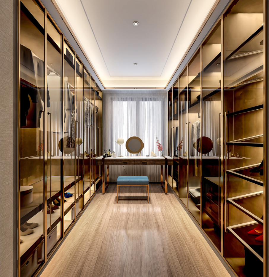 • 對稱美學在這里得到了完美體現,通頂衣柜一左一右對立,中部設置梳妝臺與方凳,整齊又和諧。 金框玻璃門的構造,讓衣柜具有展示柜的功能。內部裝上補光燈,撐起輕奢風,透漏出高級感,時尚美觀。擁有這樣有顏的衣帽間,品質感觸手可及,做生活的主角,感受美妙生活。