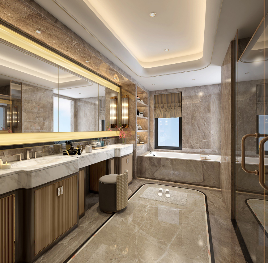 • 棕色大理石紋地磚與整體大地色系搭配,柔和的色彩過渡金色的五金,讓整個空間更為內斂。