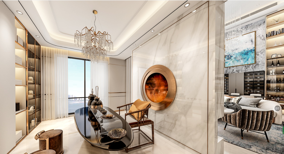 • 把現代風和古典風完美的結合在一起,硬裝會更偏向現代風,家具和軟裝會 偏向古典風,整體感覺十分時尚、奢華、有品位。