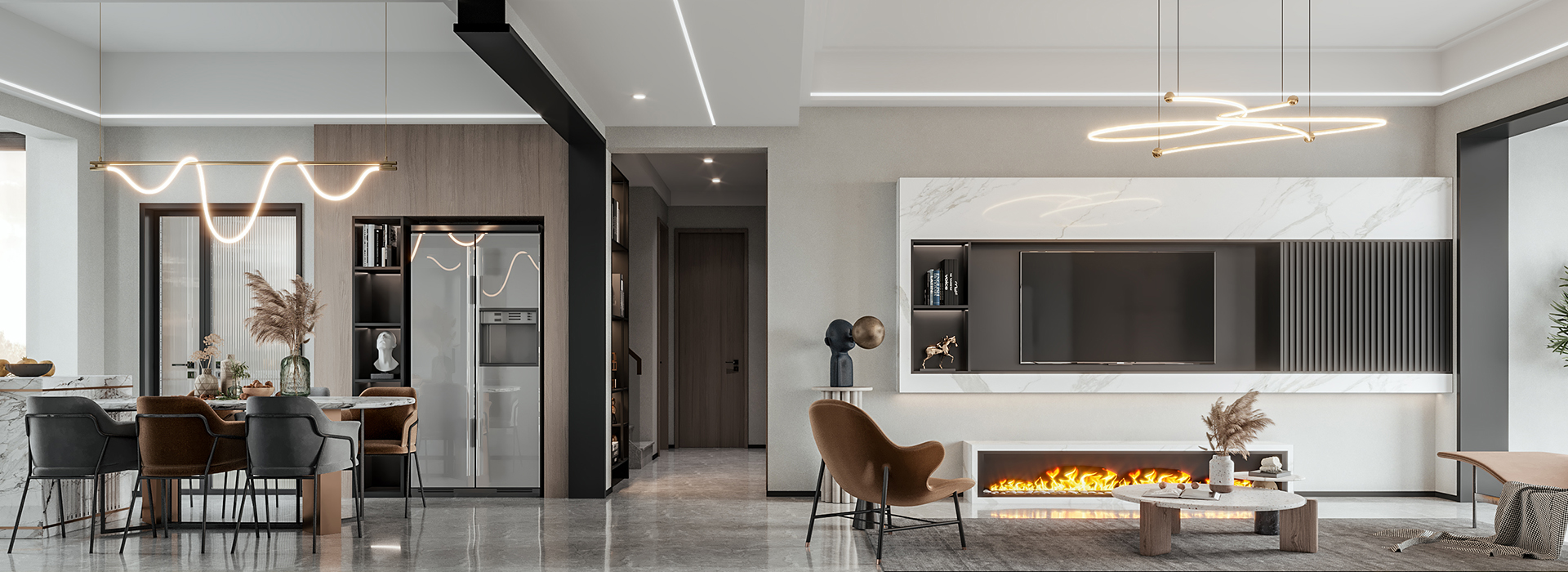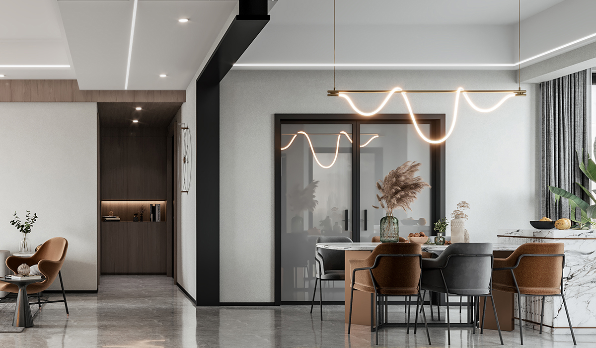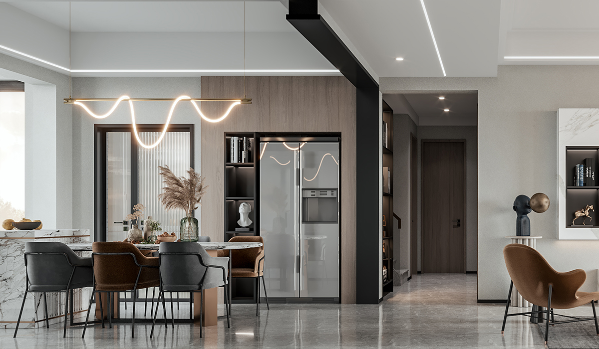 本案是現代輕奢風,造型簡潔大氣,空間處理上層次感豐富,但多而不亂,通過線條的處理空間劃分清晰明顯,但是又有整體感,地面磚采取通鋪的形式既放大了空間的視覺,又把整個空間歸為一體,儲物空間多而不雜,充分利用了過道,樓梯等處,把冰箱酒柜等收納其中,沒有突兀感,燈光的使用比較細致,每個區域都有相應的燈光營造氛圍,整體感覺協調大方