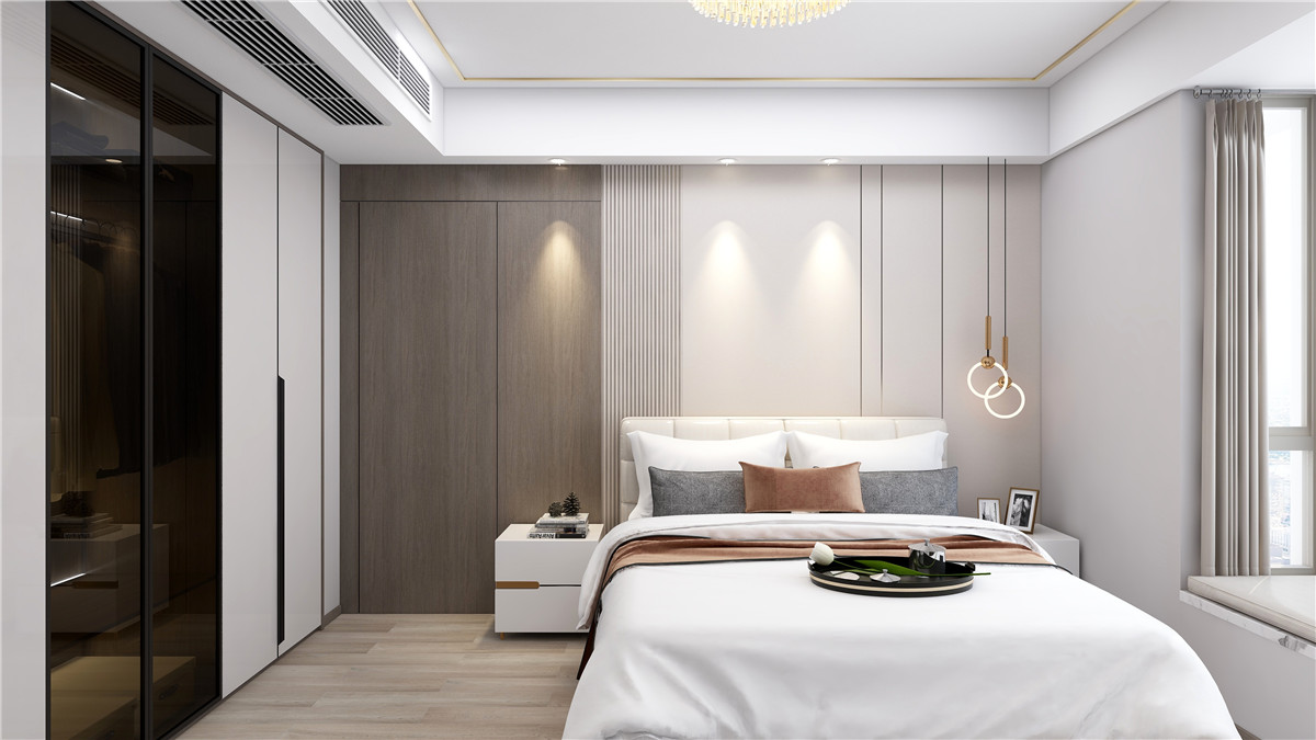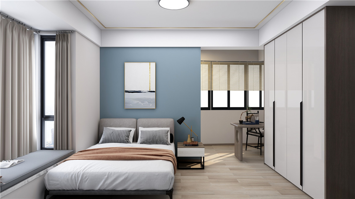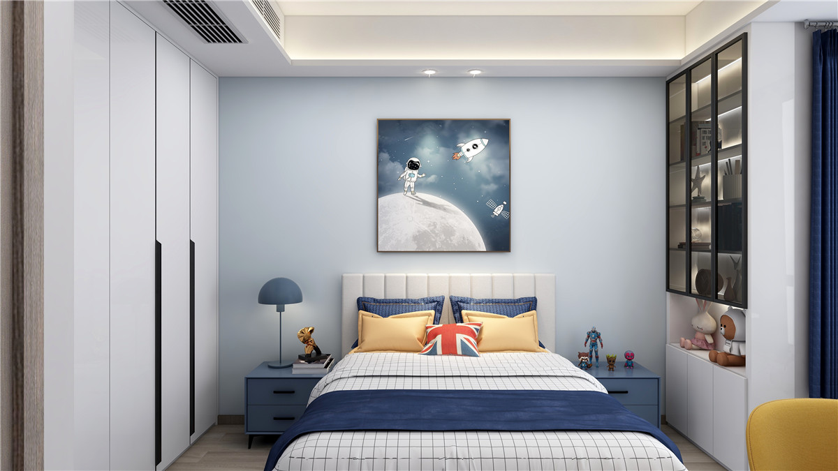 該房主為年輕有為的地大教授,孩子上小學,一家三口都非常喜歡看書學習,故臥室里都設置了書柜書桌。業主比較喜歡時尚流行的風格元素,也要求有更多的收納空間,故推薦現代輕奢風格。