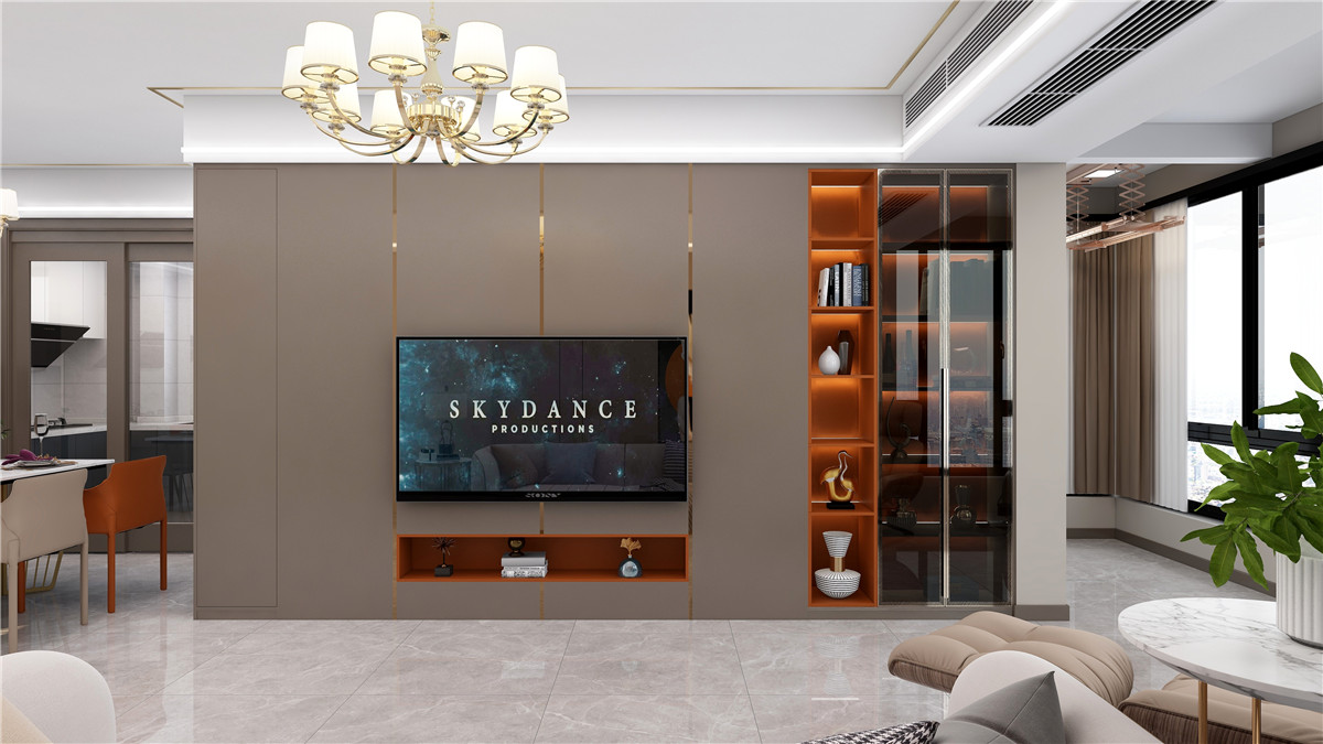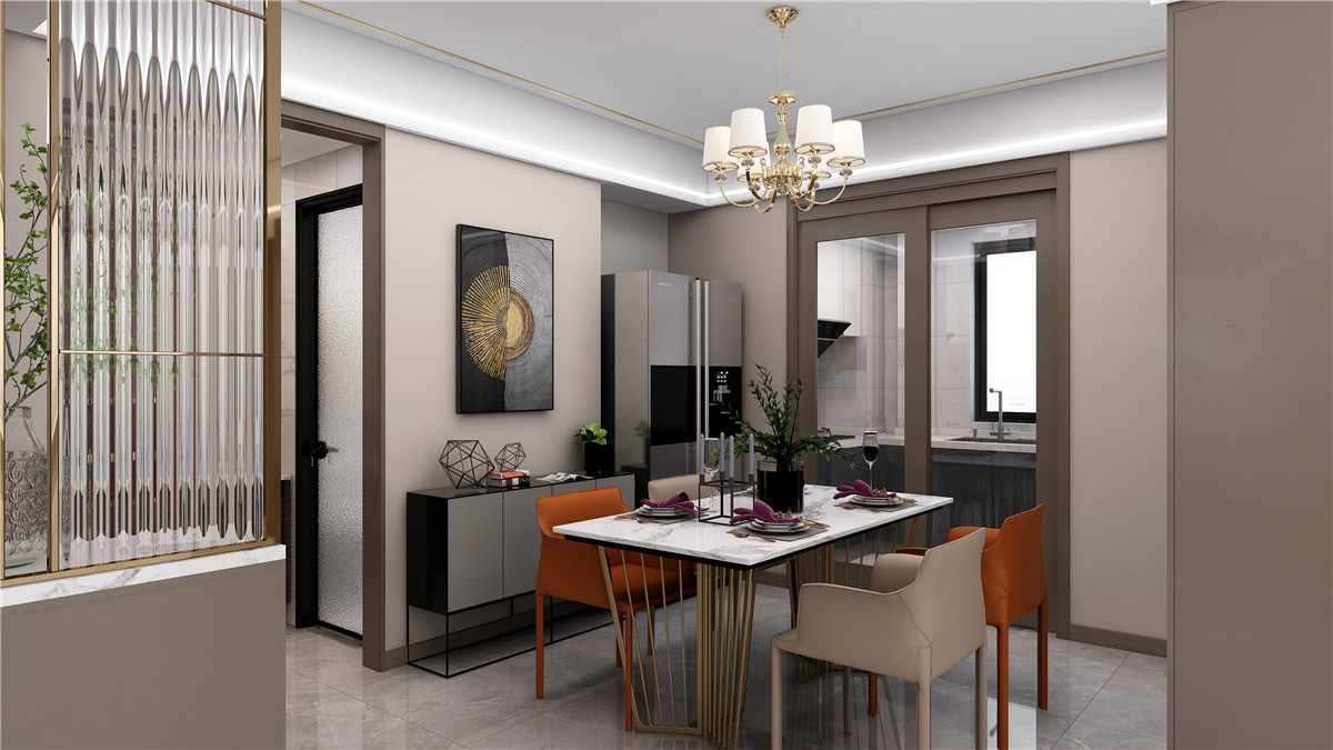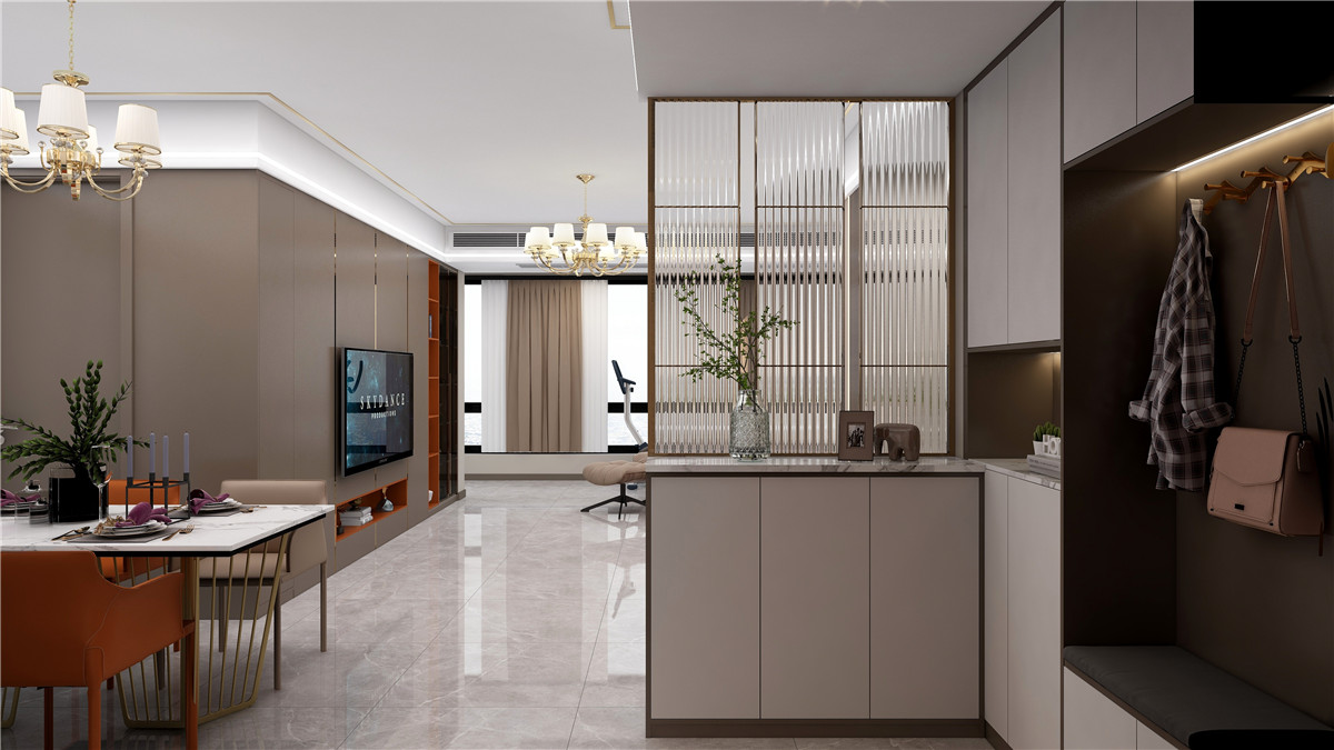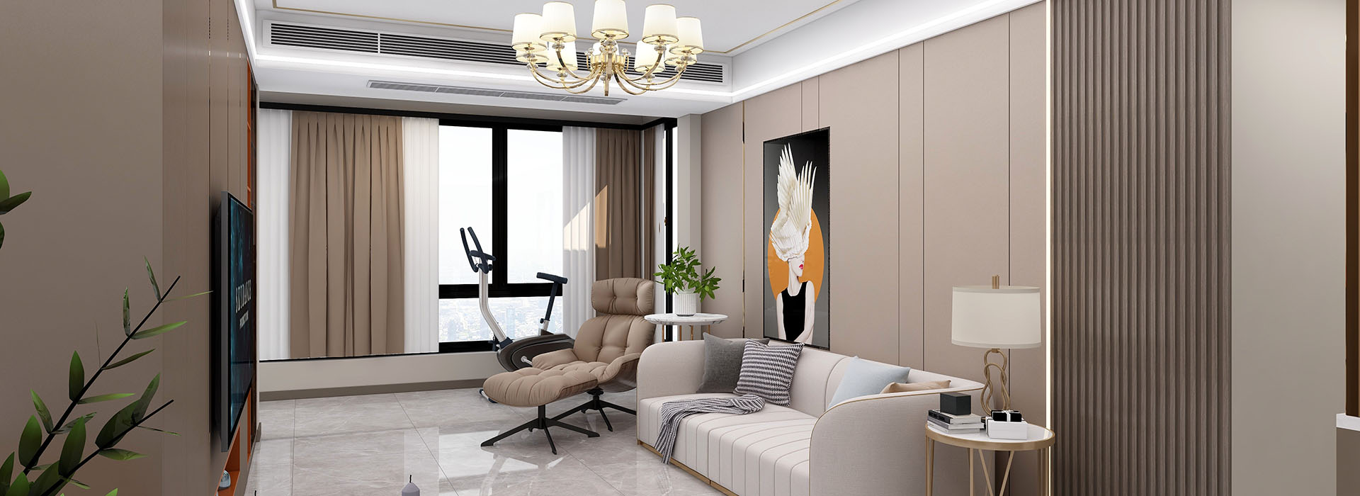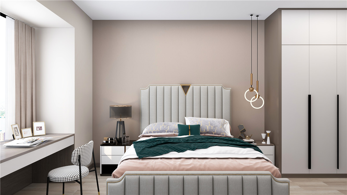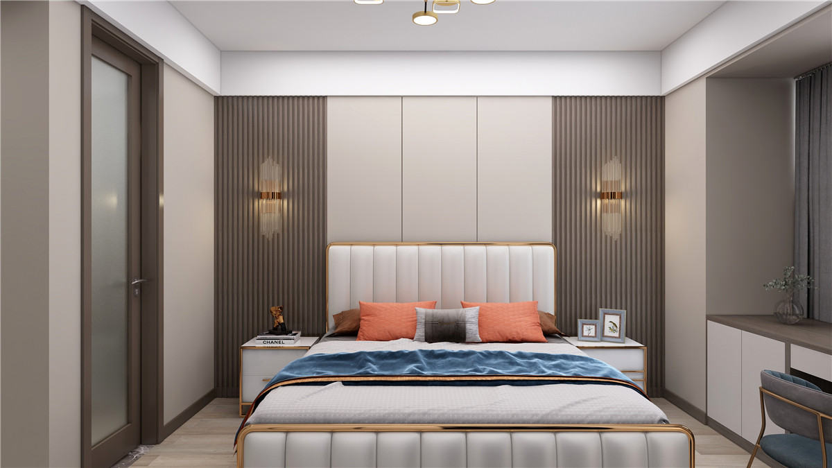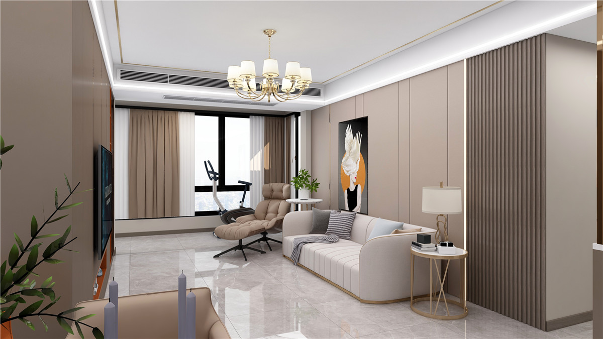 該房為業主改善住房,男主人經常出差,比較喜歡酒店風格,女主喜歡健身,喝茶,故在客廳陽臺處設計留了健身區,吧臺區。該房主兒子和父母會偶而來居住,所以另外兩間房都以臥室設計為主,并設置了書桌功能。