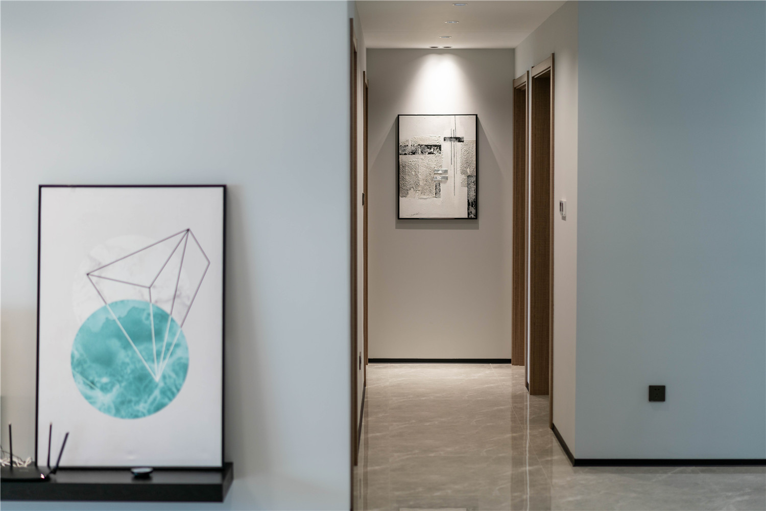 • 極簡的吊頂搭配開闊的空間,輕盈不失層次感。軌道燈與筒燈做室內光源,簡單的點、線、面組合,就呈現出了現代簡約的時尚美感。