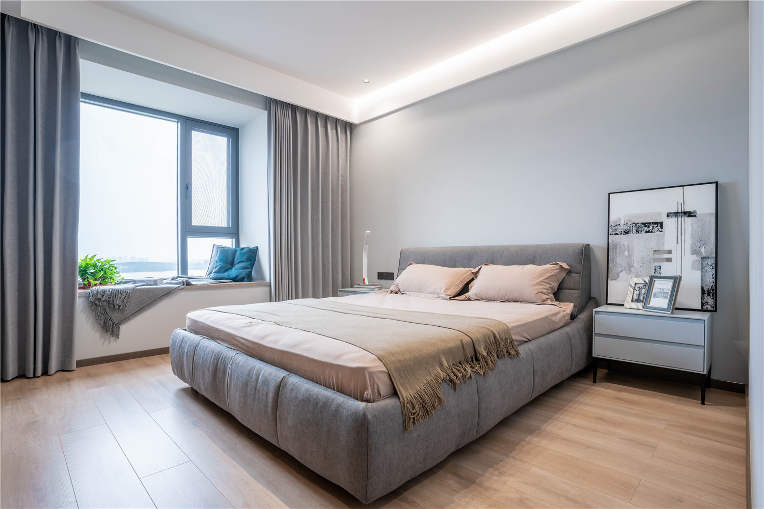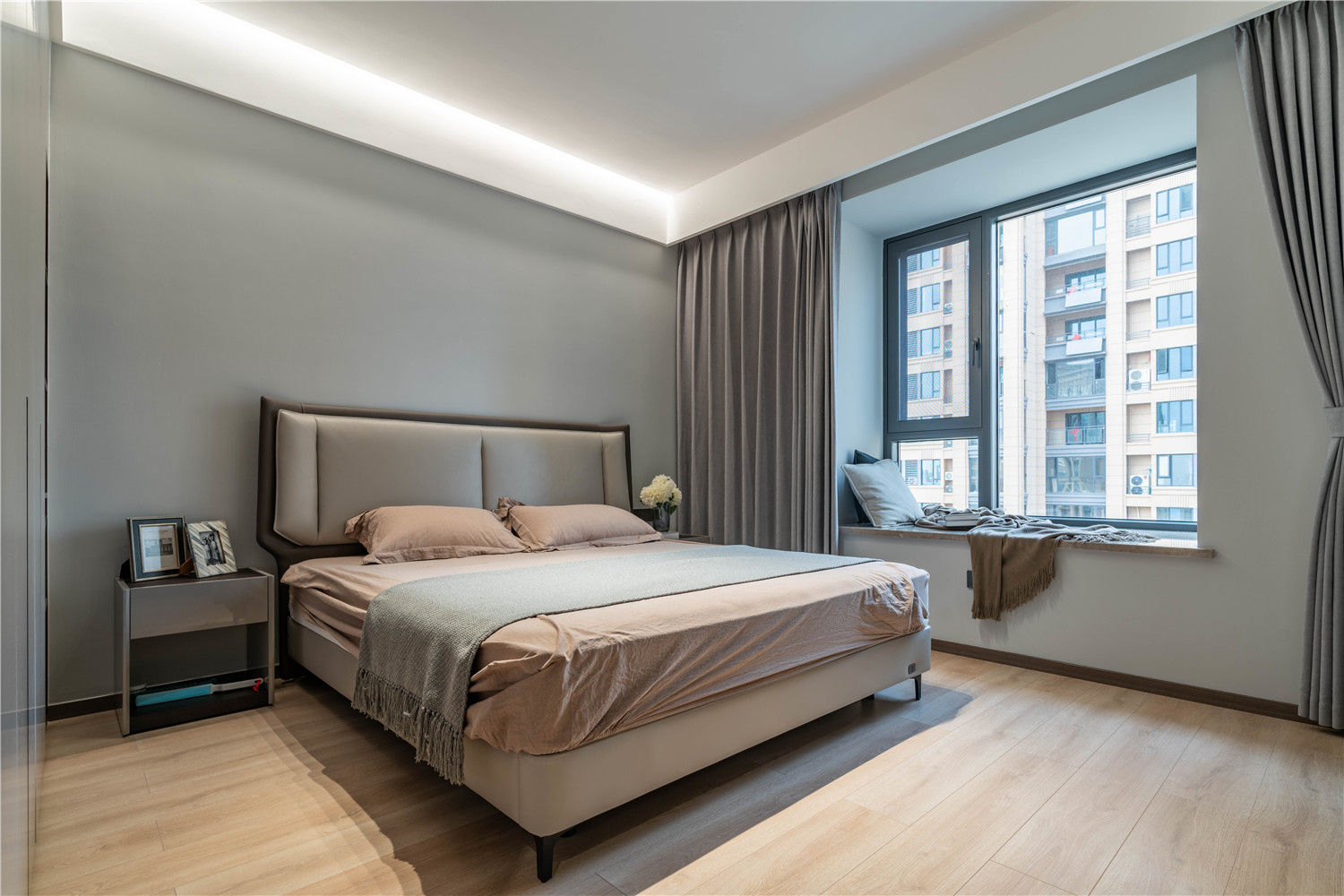 • 秉持優雅淺淡的基調,摒棄了繁冗復雜的色調與修飾,以靜謐的灰色墻面搭配溫潤的原木色地板,構筑了這方溫馨安逸的就寢環境。