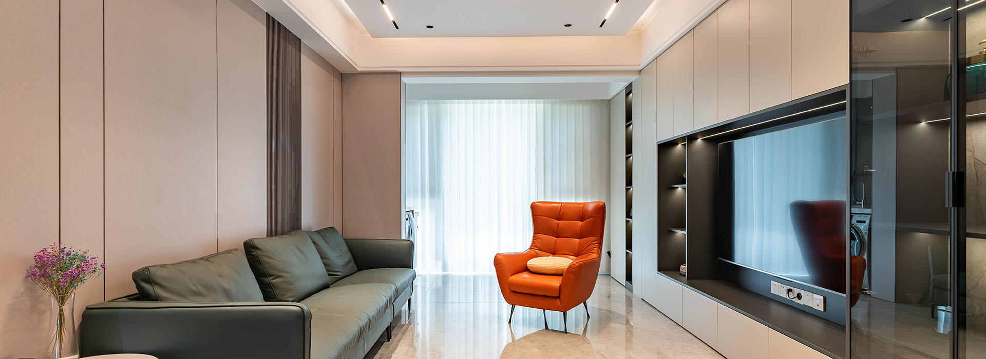 設計師選用現代簡約風,并采用無主燈的設計手法,借用隱和藏的概念,將餐廳門“隱”去,將承重墻、橫梁結構等“藏”住,讓整體空間更顯開闊大氣。并搭載智能家居系統,通過合理的空間規劃增加儲物空間,共同構筑了這個現代化的舒適家居空間。