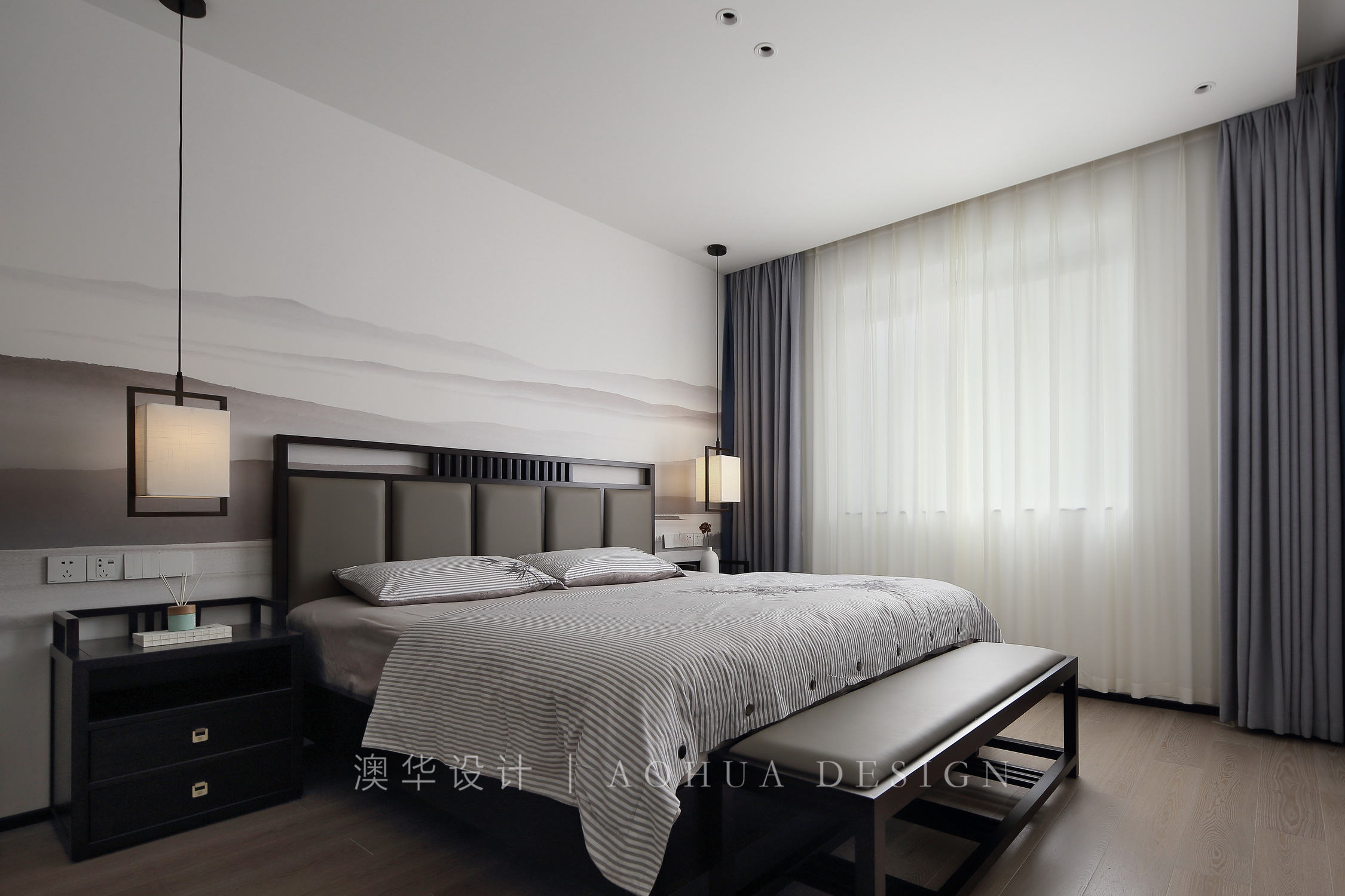 • 主臥臥房空間清晰明亮素雅,萃取一抹山水作為視覺符號,浸透著東方特有的禪思靜謐。