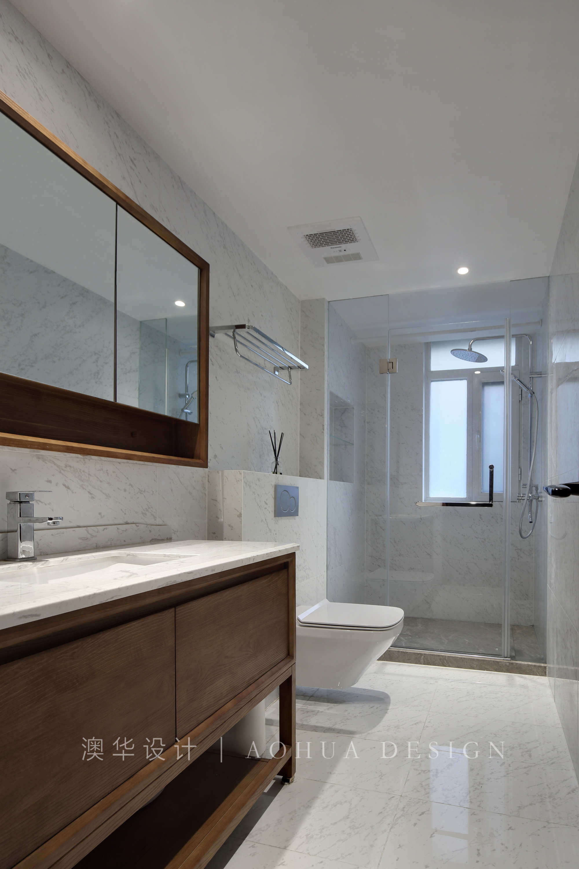 • 衛生間的空間保持潔凈,大面留白的基礎上,做了木色點綴,整潔舒適。