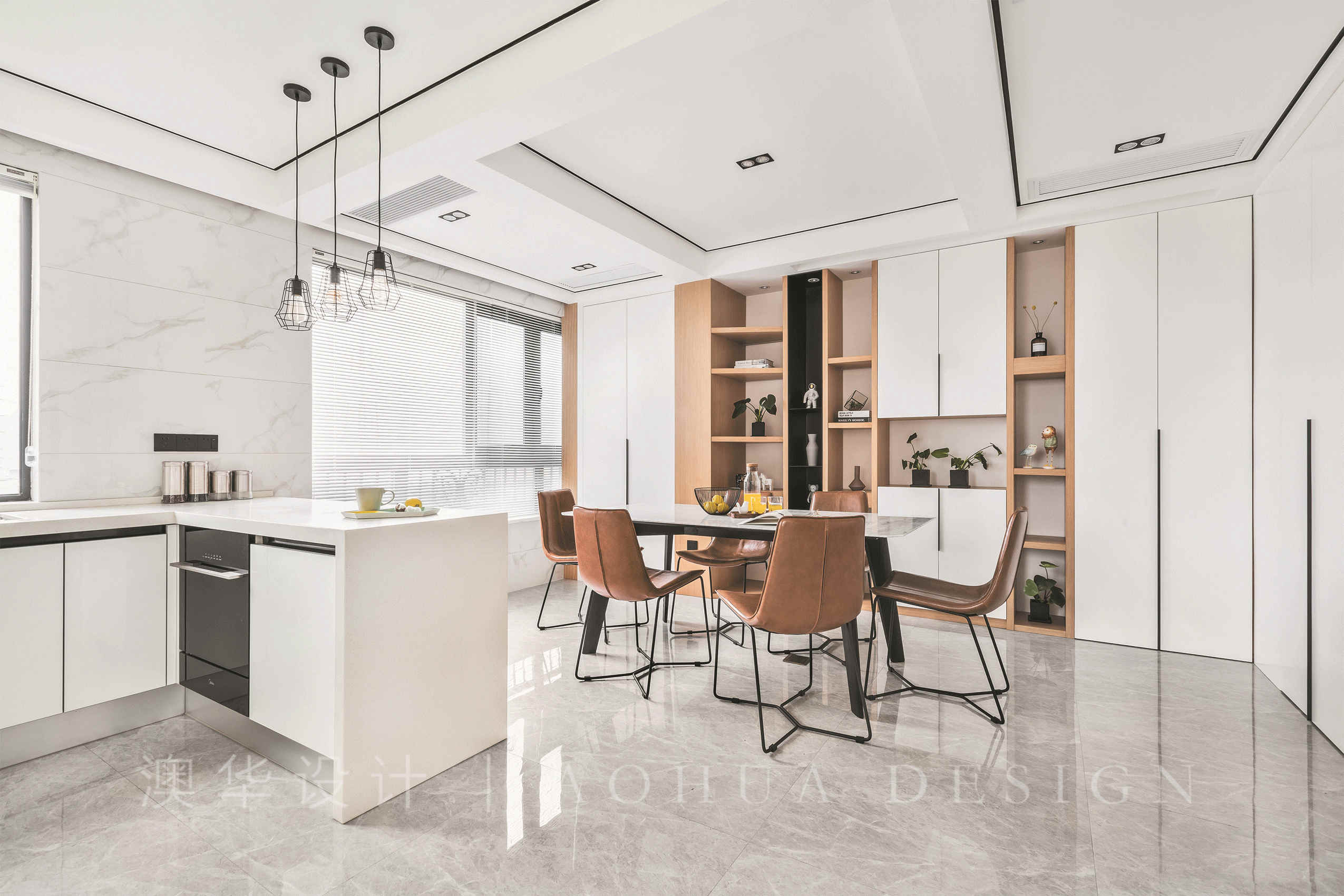 • 有開有合的餐廳儲物柜包容居者各類喜好。你可以在此放置美酒放松小酌,也可以是書本以供茶余飯后的品讀。而為了將該區域打造成重要的社交空間,設計師還在此預留了投影幕布凹槽,為今后業主的生活增添了更多的趣味與活力。