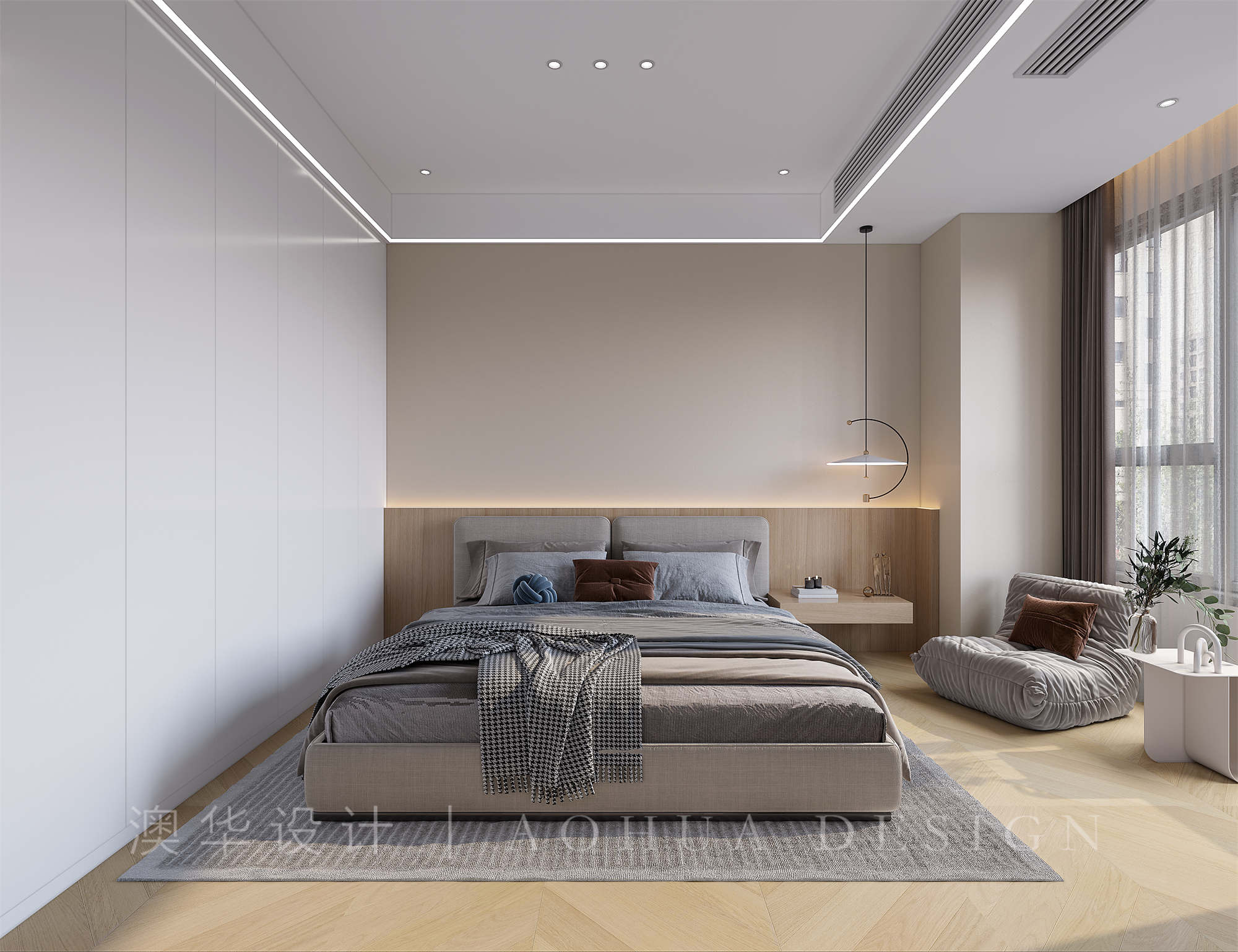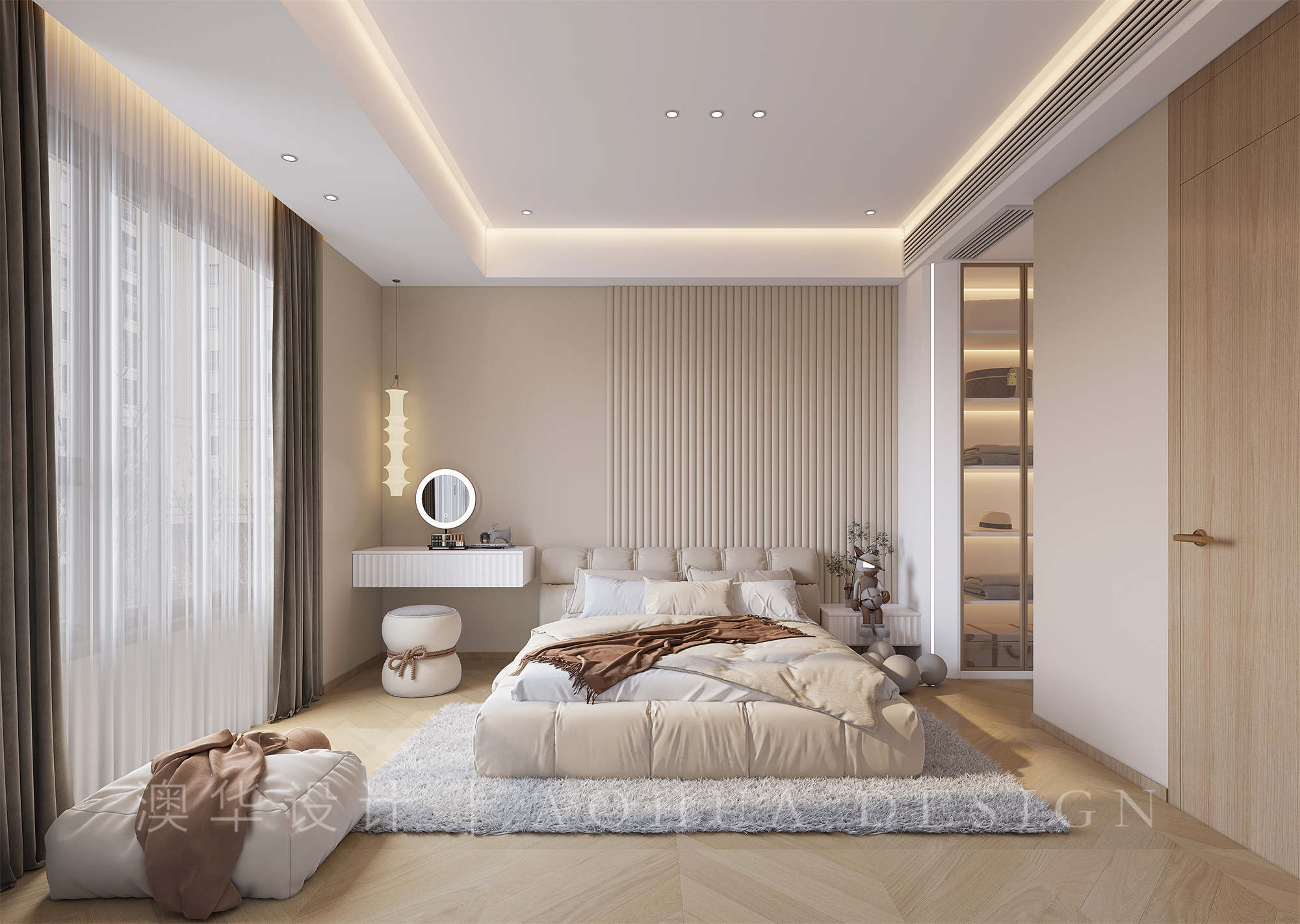 • 臥室采用統(tǒng)一的奶油感涂料,頂部也盡量簡潔。窗簾與床色調(diào)一致,奶灰質(zhì)感更顯溫馨柔和