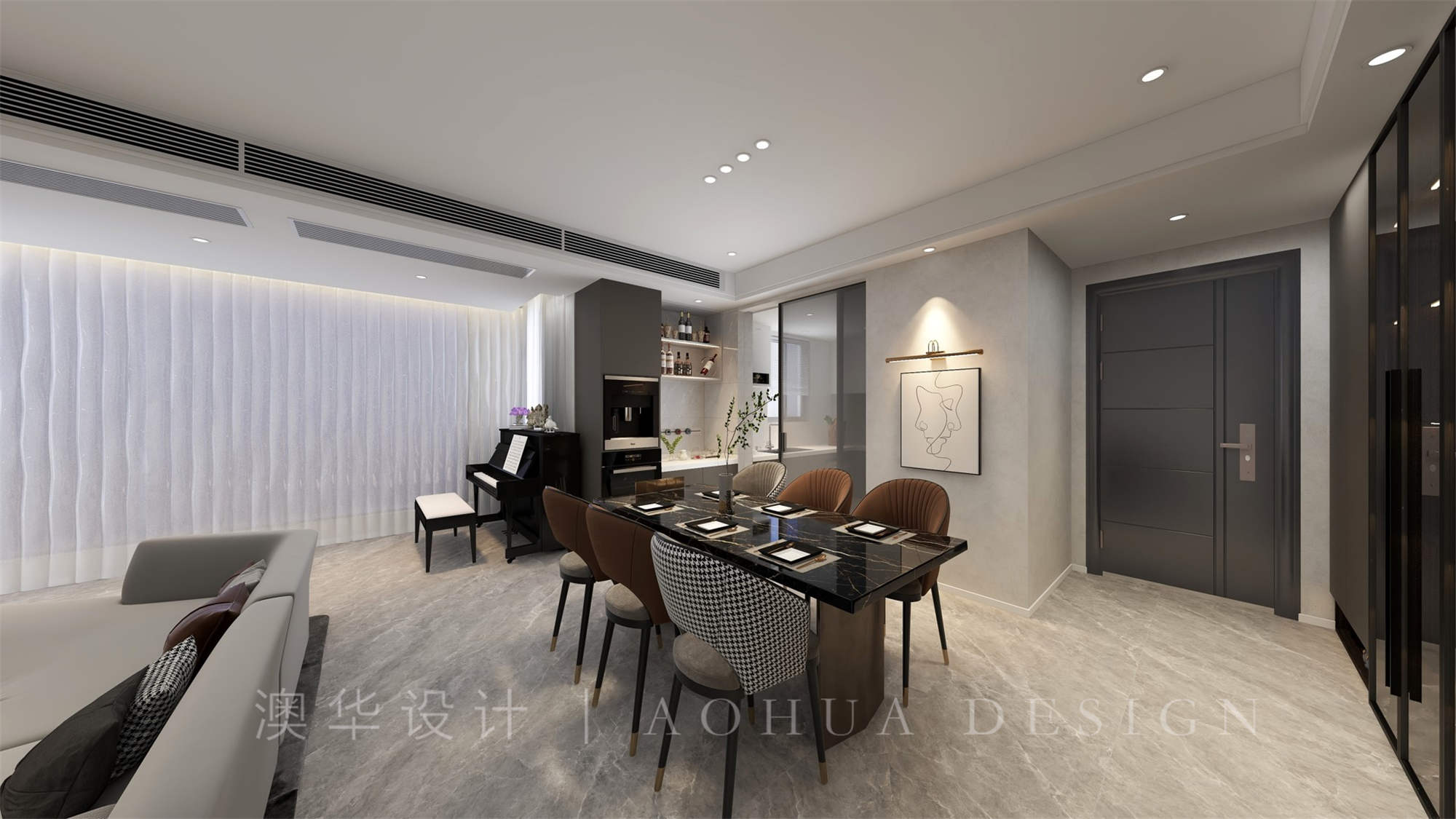 • 設計師將餐廳和客廳做為一體式,給與客戶進門視野開闊。