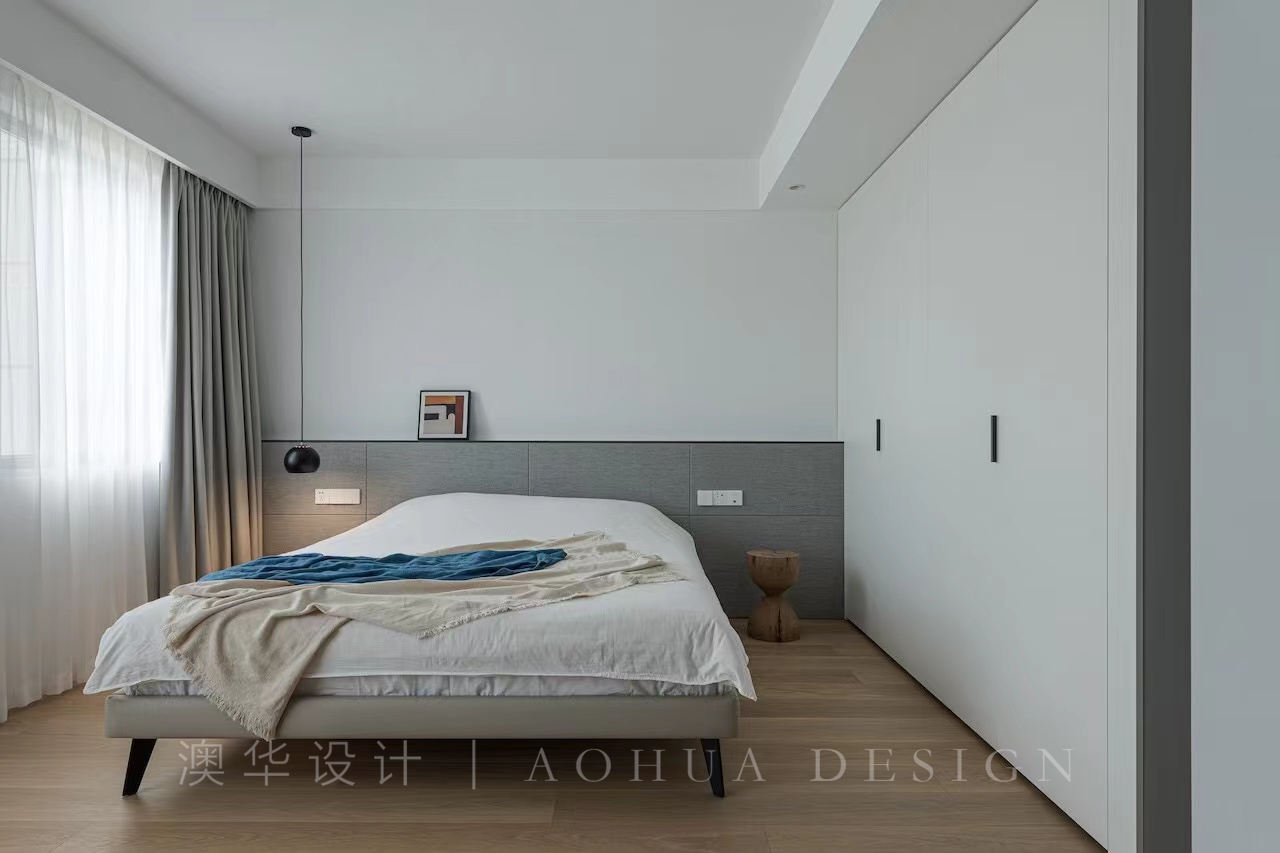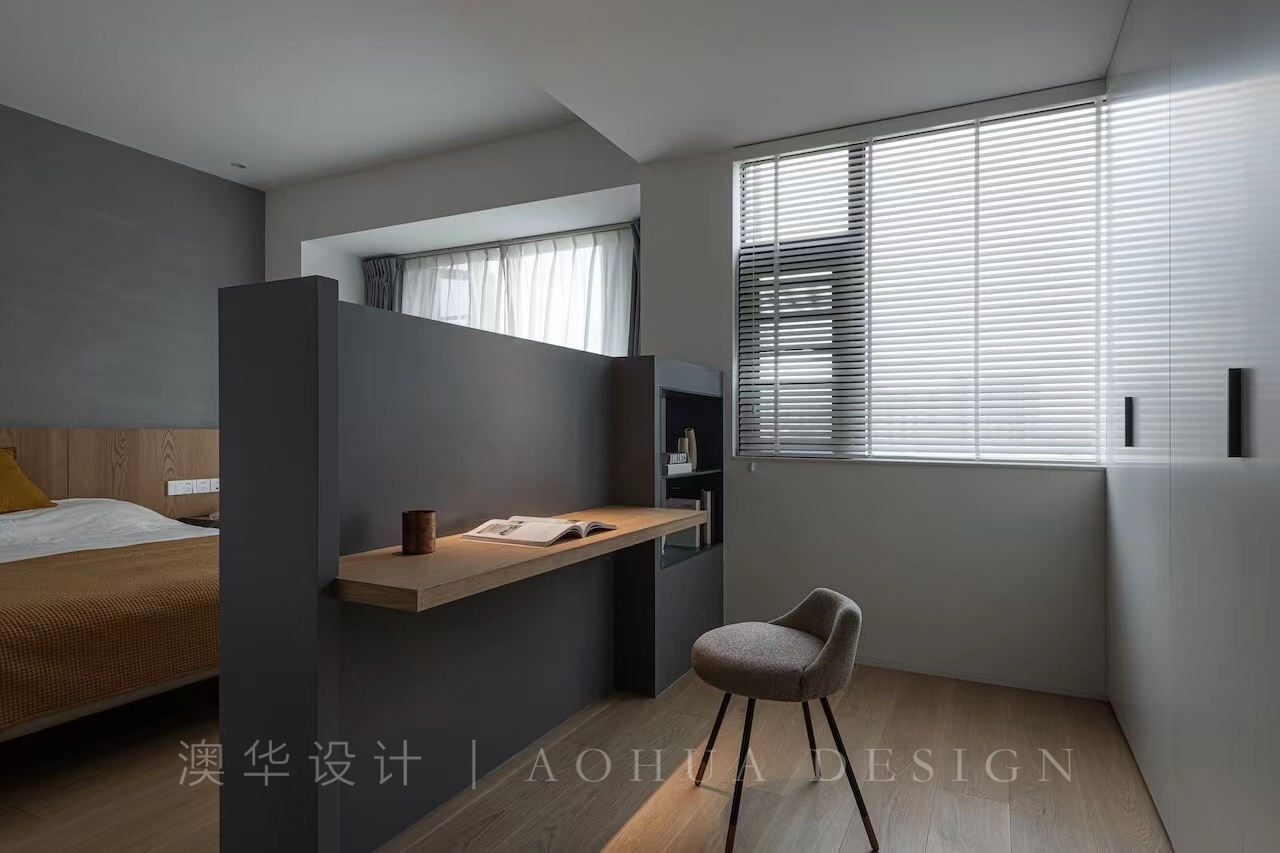 • 主臥大面玻璃窗使陽光能照進整個臥室,每天醒來都能一眼看到窗外景色,豎條百葉簾代替窗簾更加便于打理,定制深色木質床頭柜與純白啞光衣柜不同材質的融合,使得原本拘束的擺放方式巧妙地重置,給原本零散的家具給予現代極簡的視覺統一。
